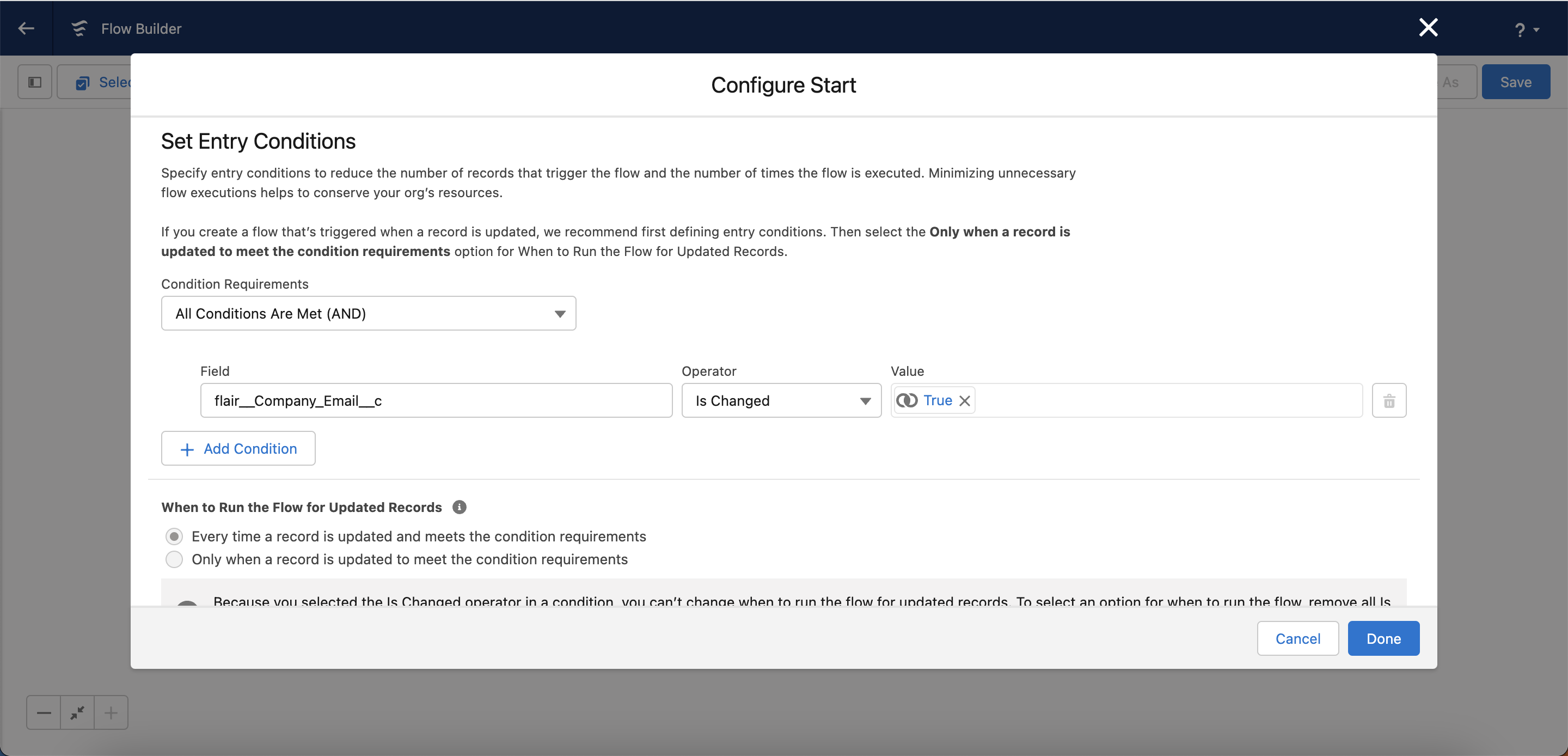 The Salesforce Flow Builder allows you to define many different conditions that will automatically trigger specific actions. In this example, we will create a flow that sends a Hub invitation as soon as an employee’s company email is updated.