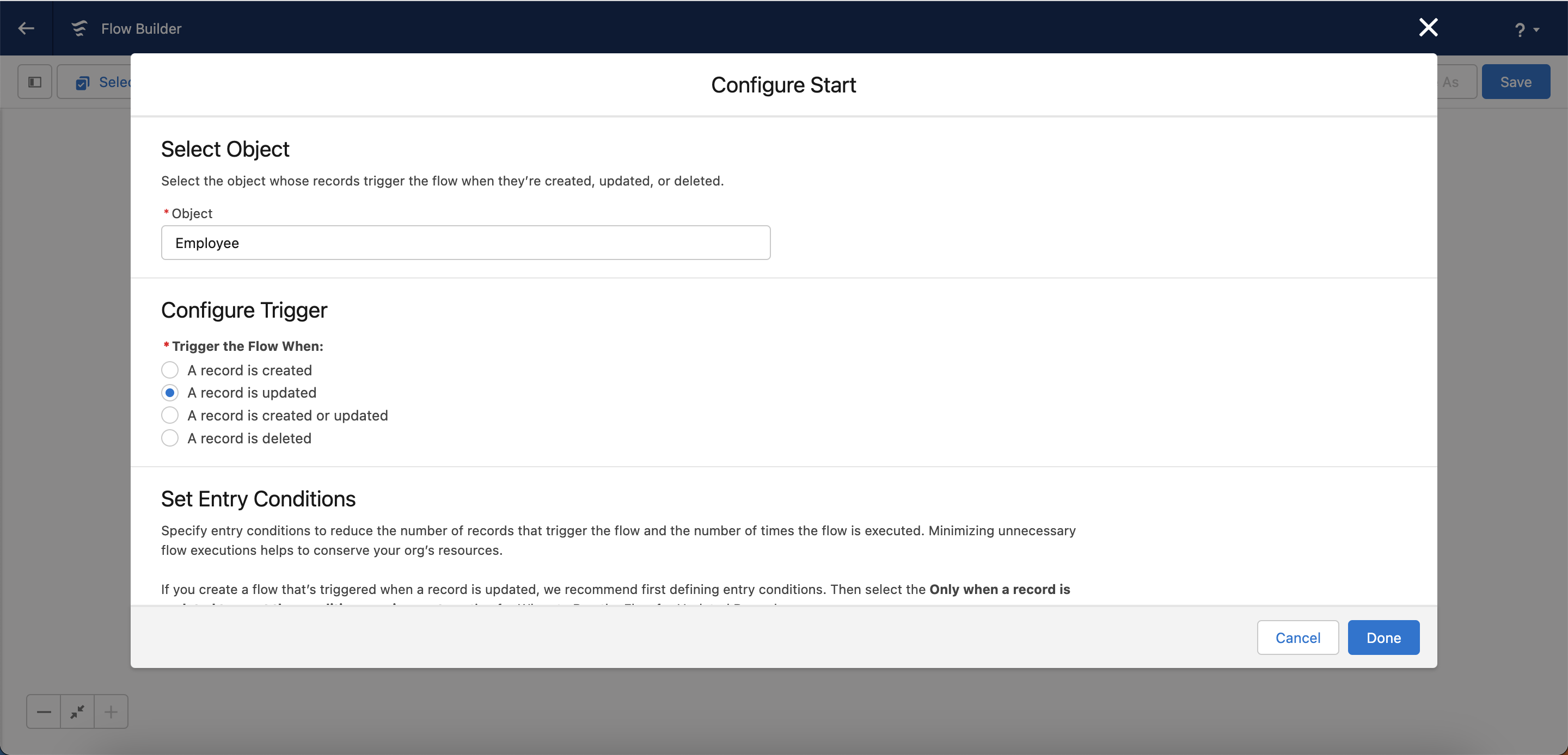 Click the New Flow button to start creating your flow. If you navigated to the Flow Builder using the steps above, the Object field should be prefilled with Employee. Under Configure Trigger, select “Trigger the flow when a record is updated”.