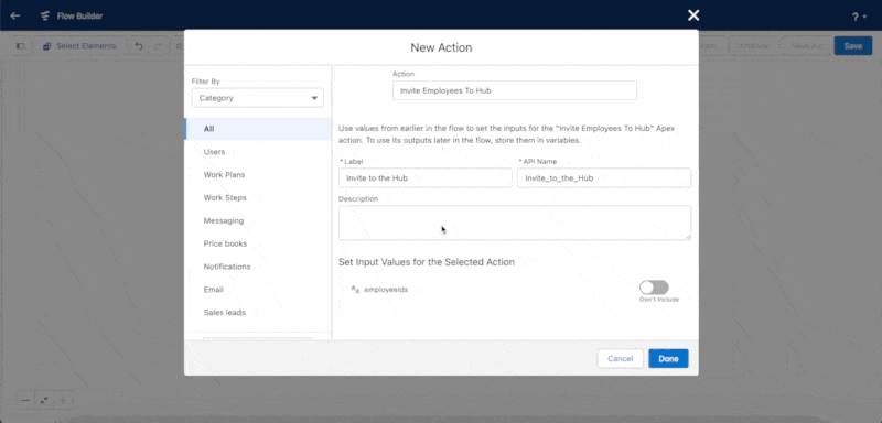 Using the search bar, find the Invite Employee To Hub action. Then you can give your action a Label – for example, Invite to the Hub – and add a Description if needed. The API Name will be automatically filled based on your Label.