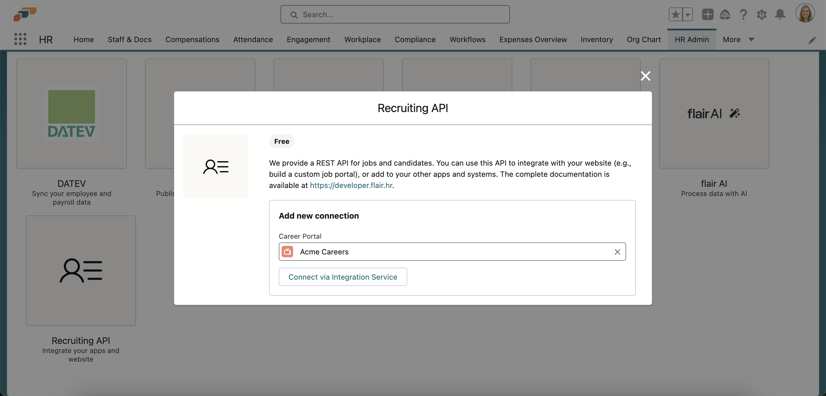 - Open the flair HR app on Salesforce and go to HR Admin. Select the Integrations tab.