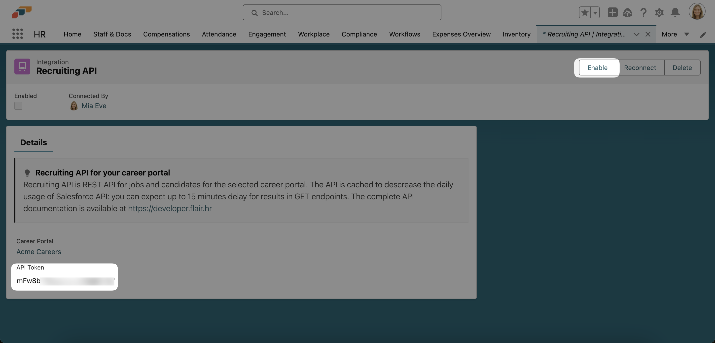 - You will be redirected to a new Recruiting API page. Click Enable and then copy the API Token at the bottom of the page.