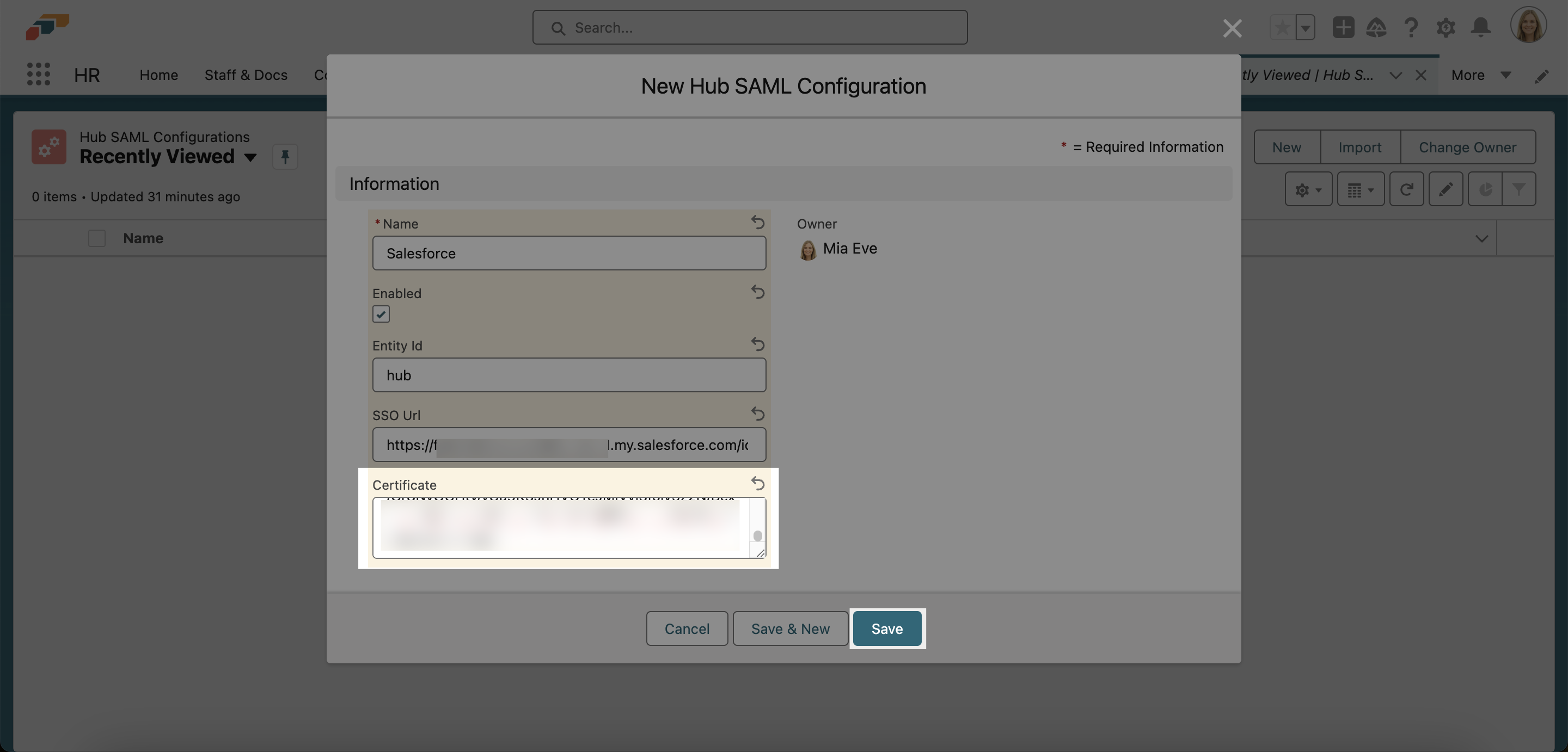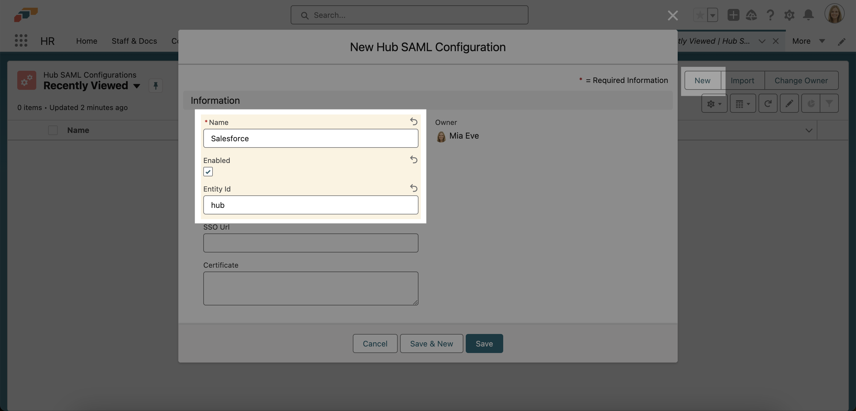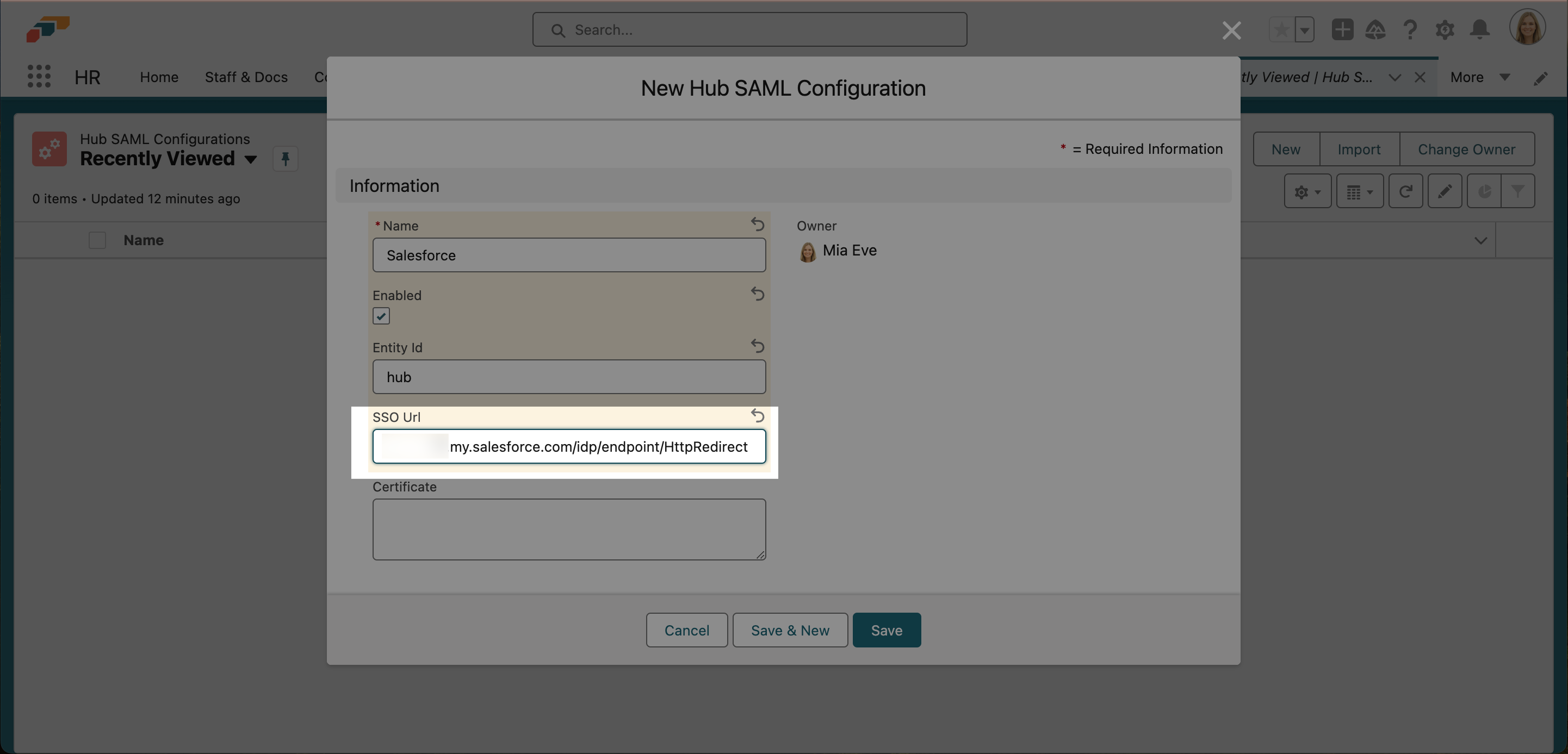 1. In the flair HR app, open the App Launcher 𓃑 and search for Hub SAML Configurations.
