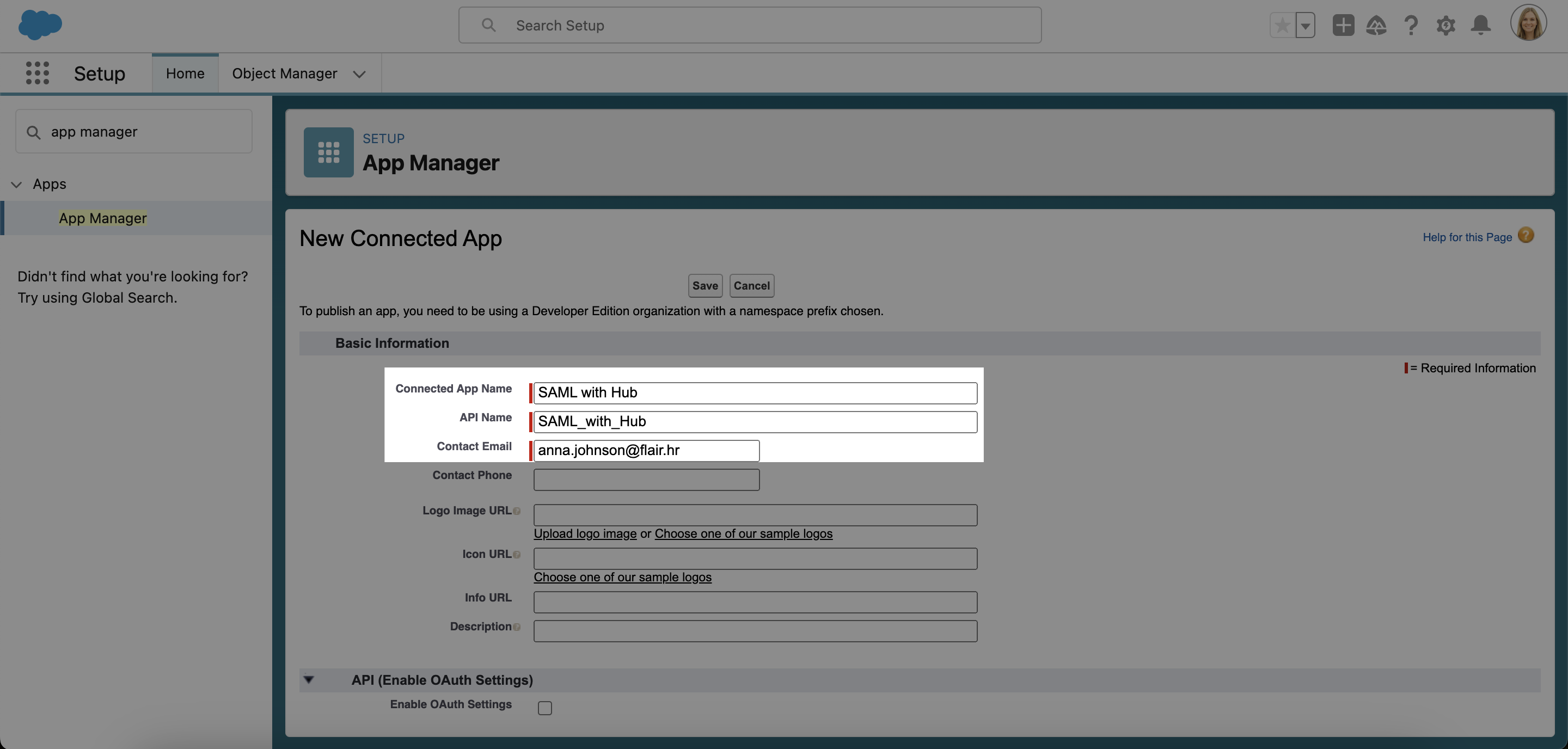 1. Give your app a name, e.g. SAML With Hub. This name will automatically be used to fill the API Name field. Enter a Contact Email address.