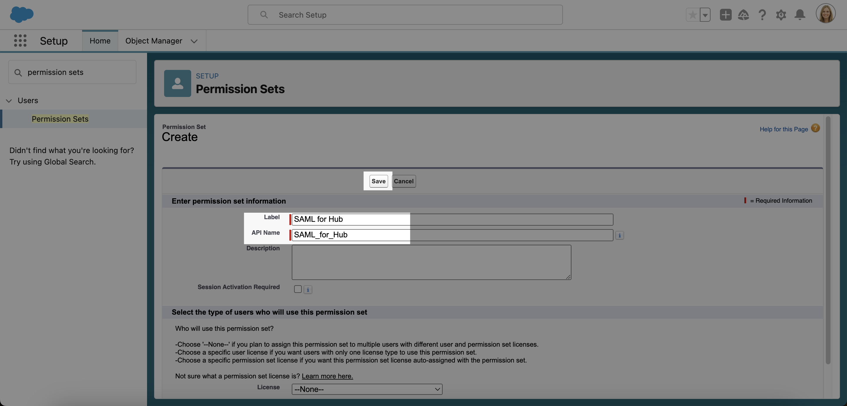 1. Give your permission set a Label, e.g. SAML for Hub. The API Name will be auto-filled. Add a Description if you would like, and then click Save.