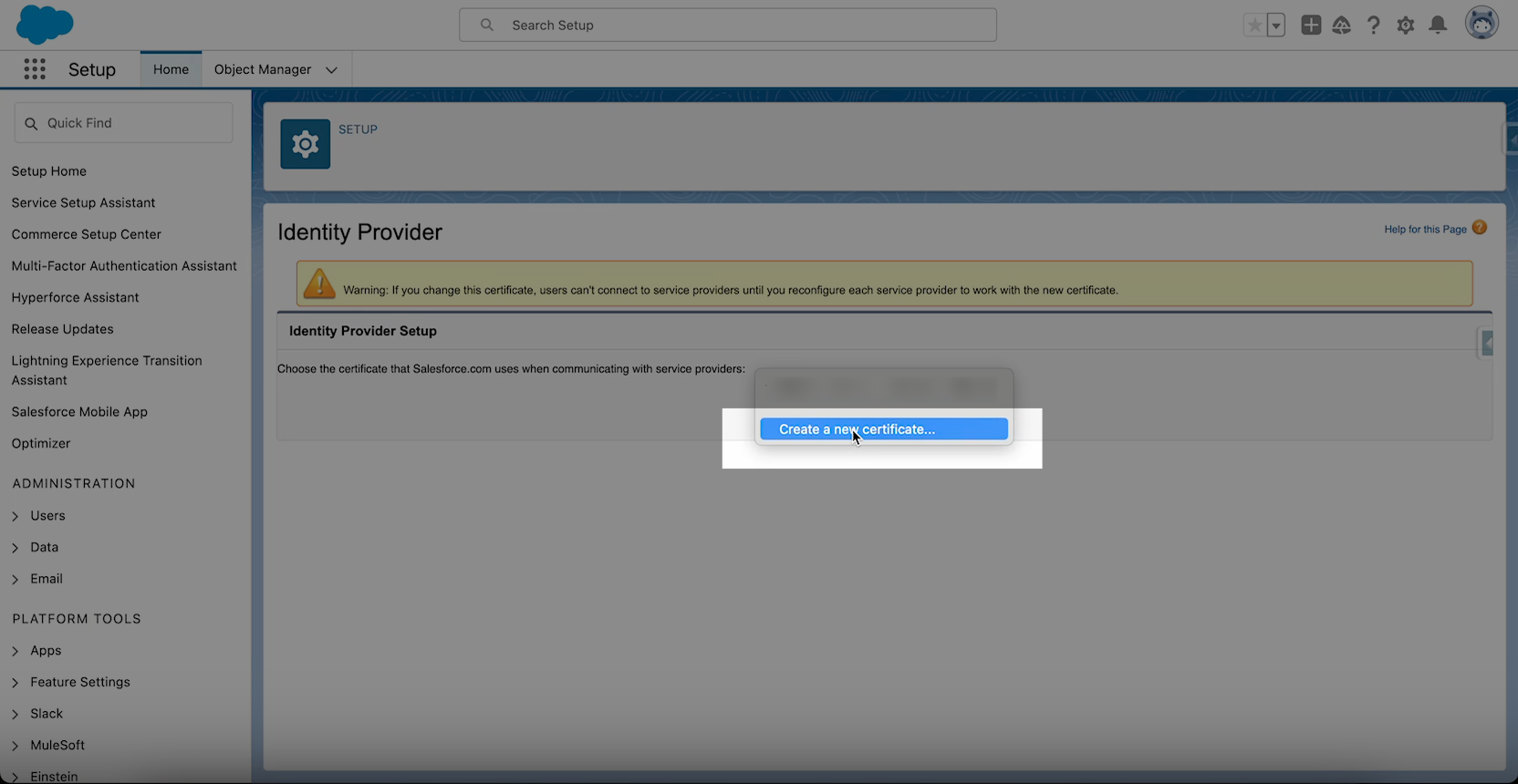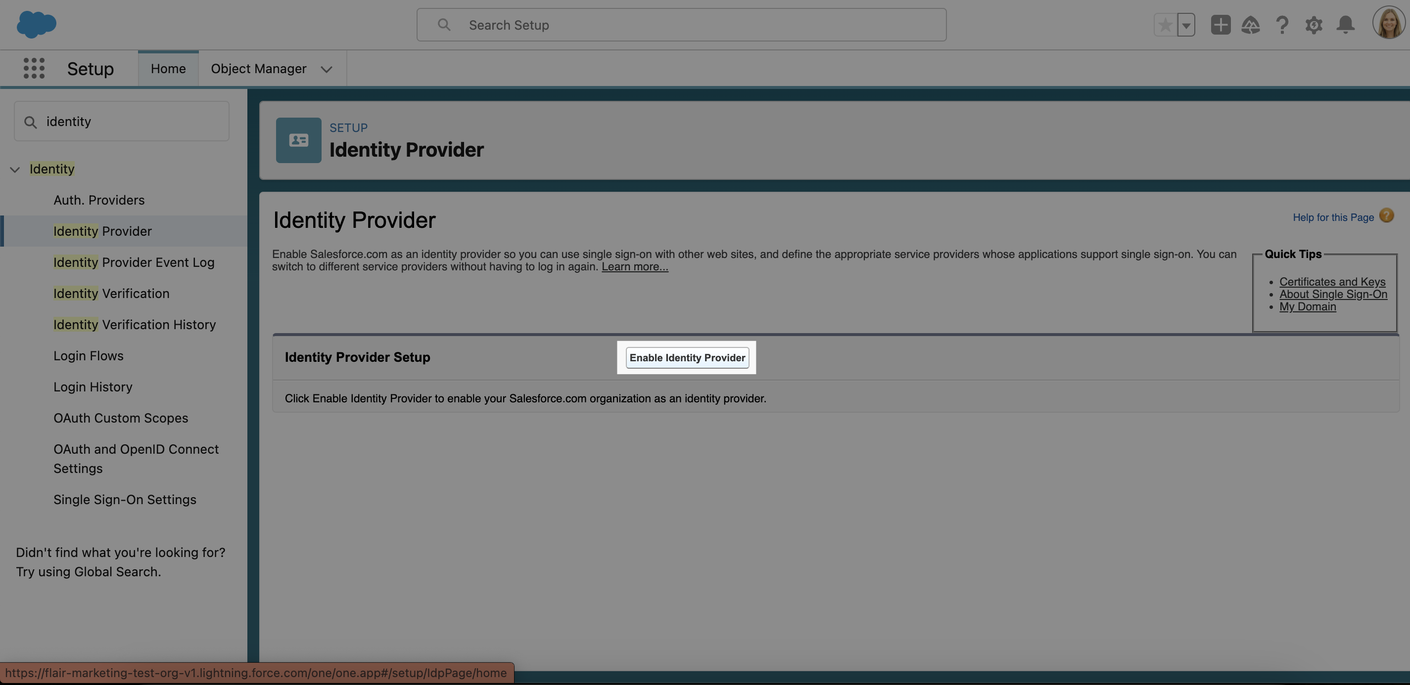 1. Open the Salesforce Setup and use the search bar in the left-side menu to find Identity Provider.