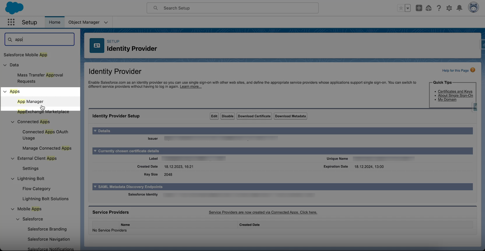 a) To find your certificate, return to the Identity Provider page and click the link next to Label.