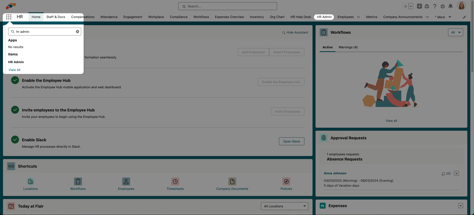 - Open the flair app in Salesforce and use the App Launcher 𓃑 or Nav Bar to find the HR Admin page.