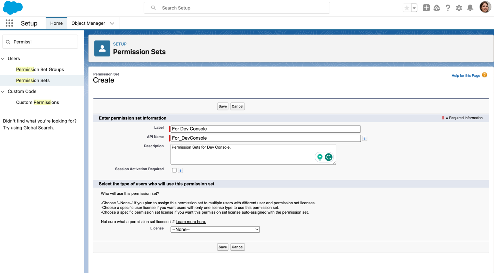 - Next, visit the Permission Sets page within the Users section and Create a new permission set. Click New on the Permission Sets dashboard. Give it a Label, API Name, and Description. Then click Save.