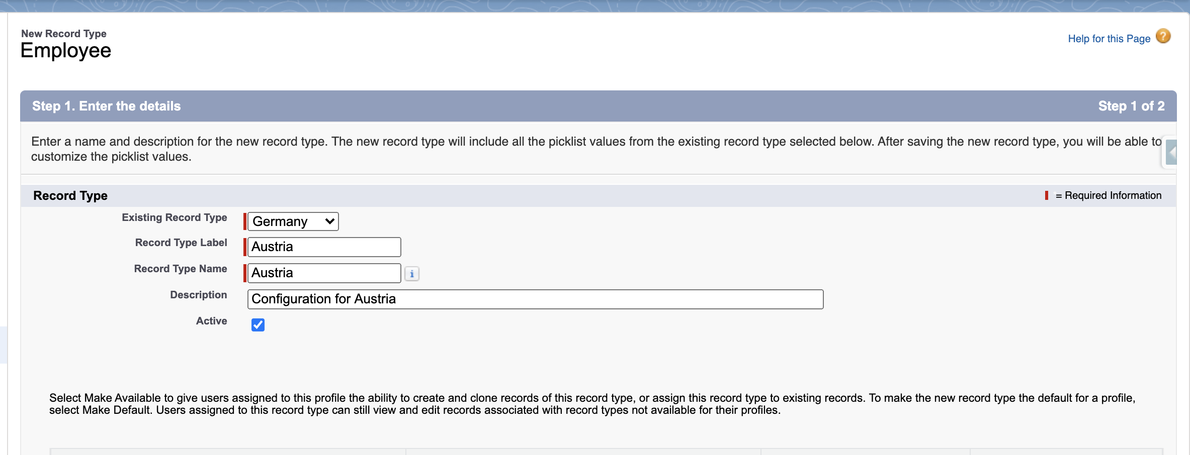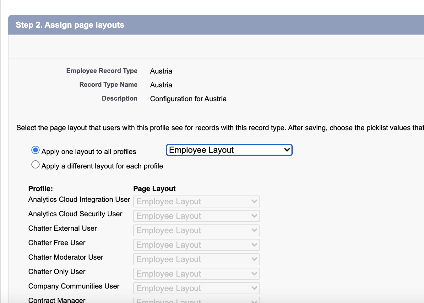 On the next page, you can assign a different layout. You should check this option if you want your additional legislation to have different sections and fields. As with record types, you can create as many new layouts as you need.