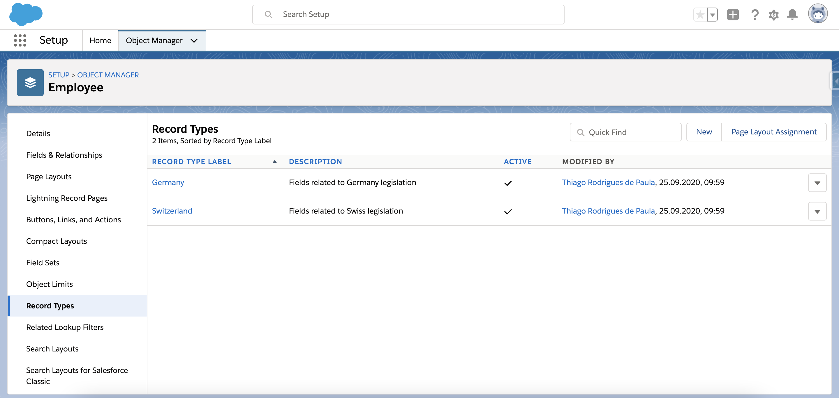 To start creating a new record, go to Salesforce Setup. Enter Object Manager into the search bar and click on Employee (flair__Employee__c). Once there, select Record Types from the sidebar on the left.