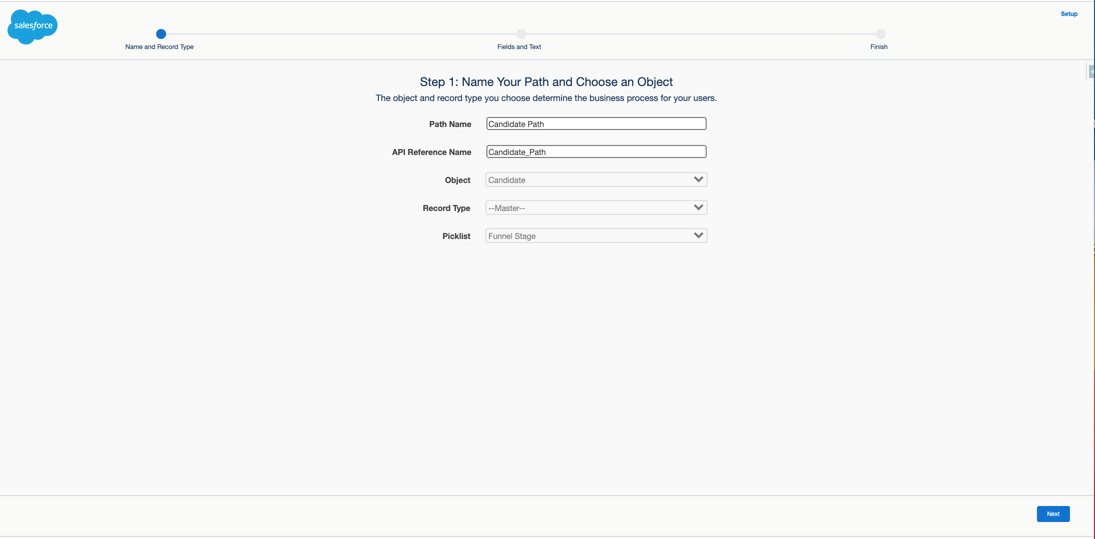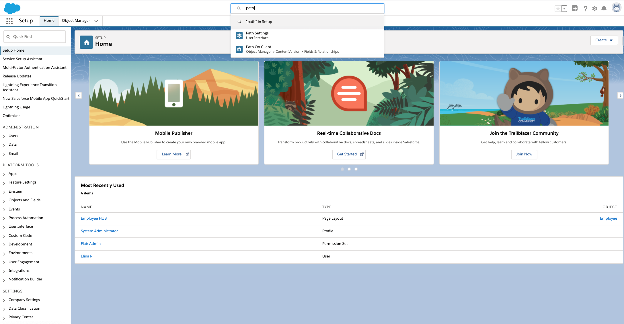 In Salesforce Setup, enter Path Settings into the search bar. You can also find this page under Platform Tools > User Interface > Path Settings in the navigation sidebar in Setup.
