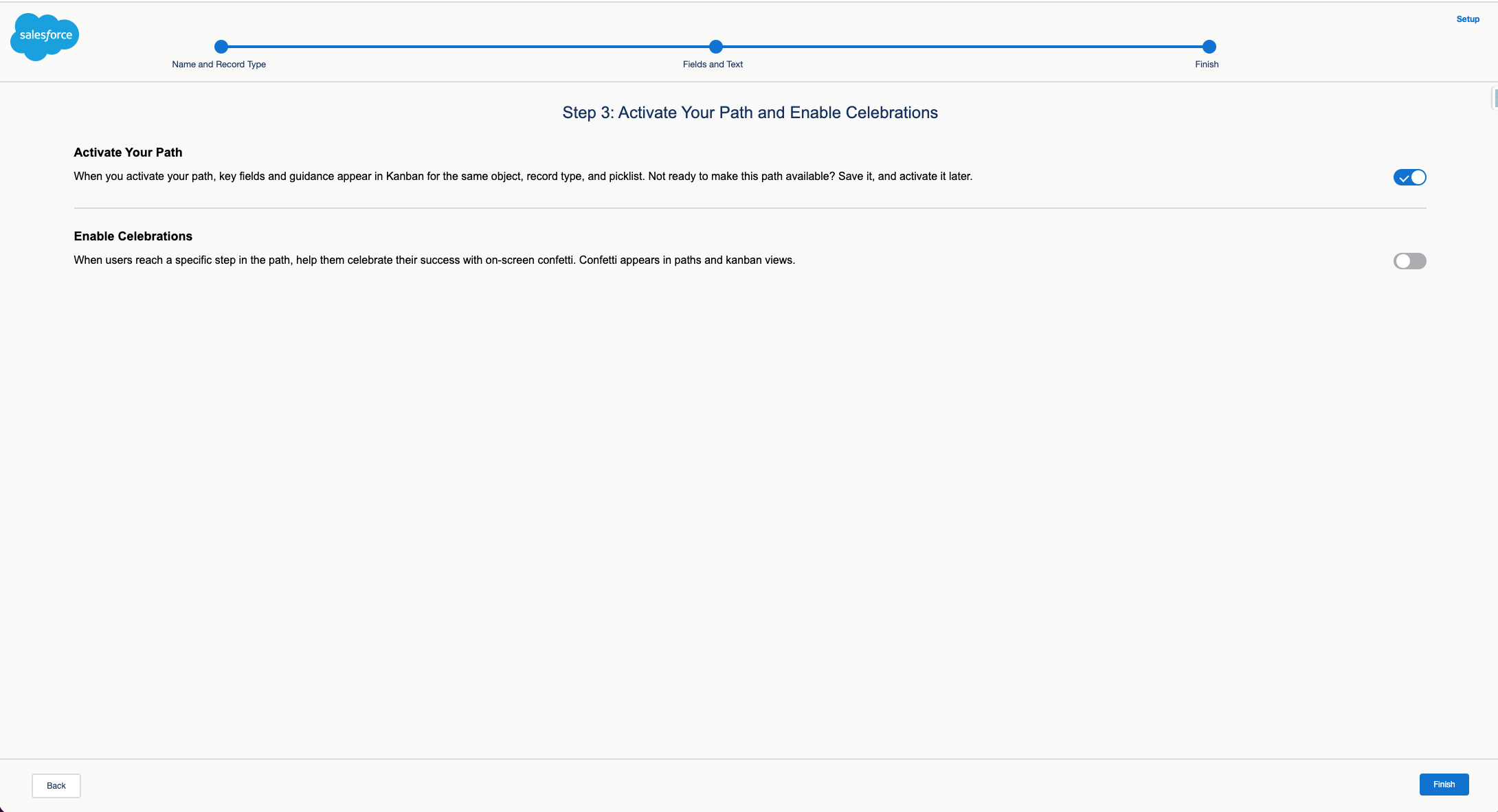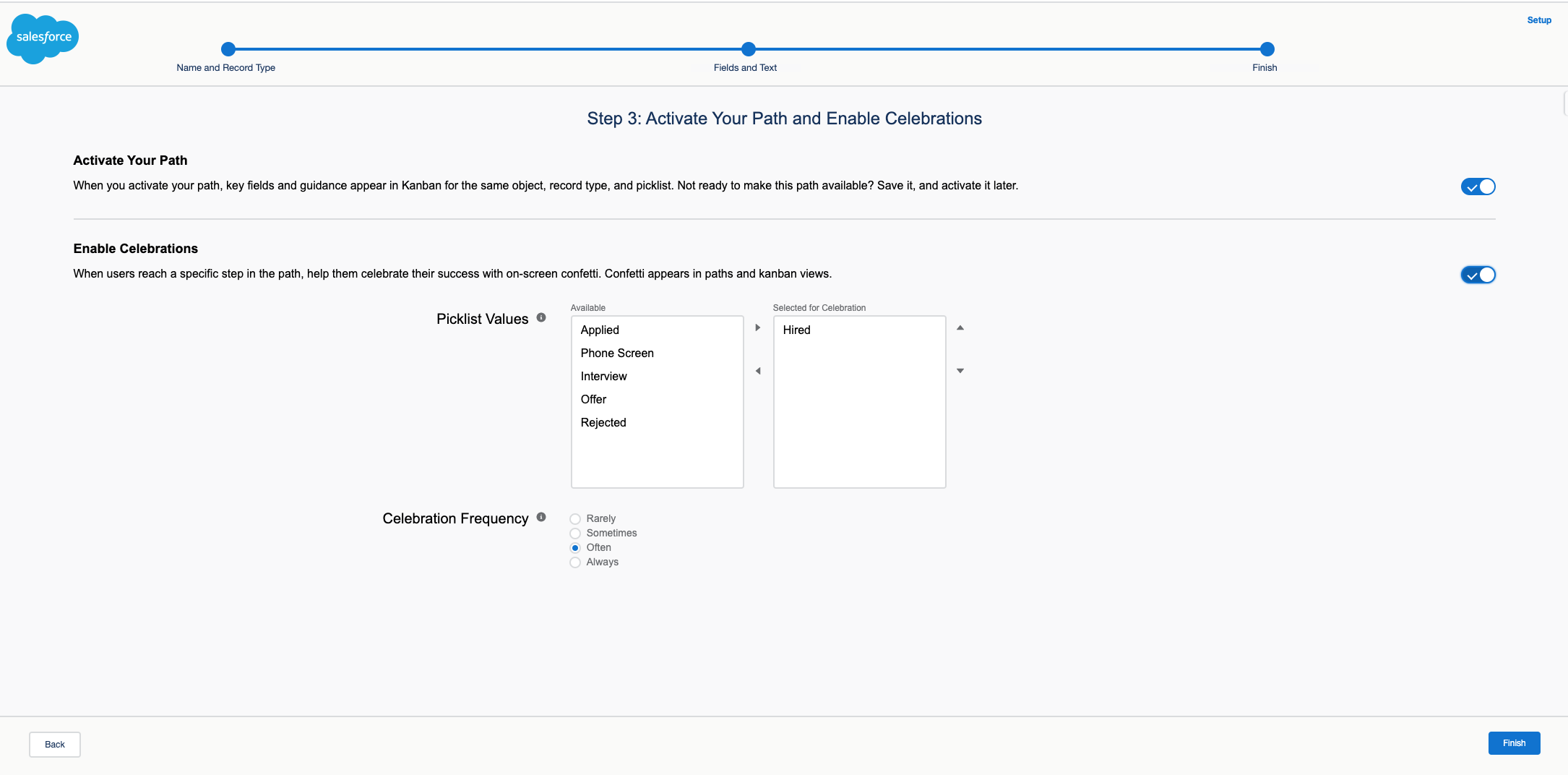 You can also activate Celebrations to make the user experience a little more fun. Switch the toggle to on, select which funnel stages you want to add celebrations to, and choose how often celebrations should appear. Now click Finish.