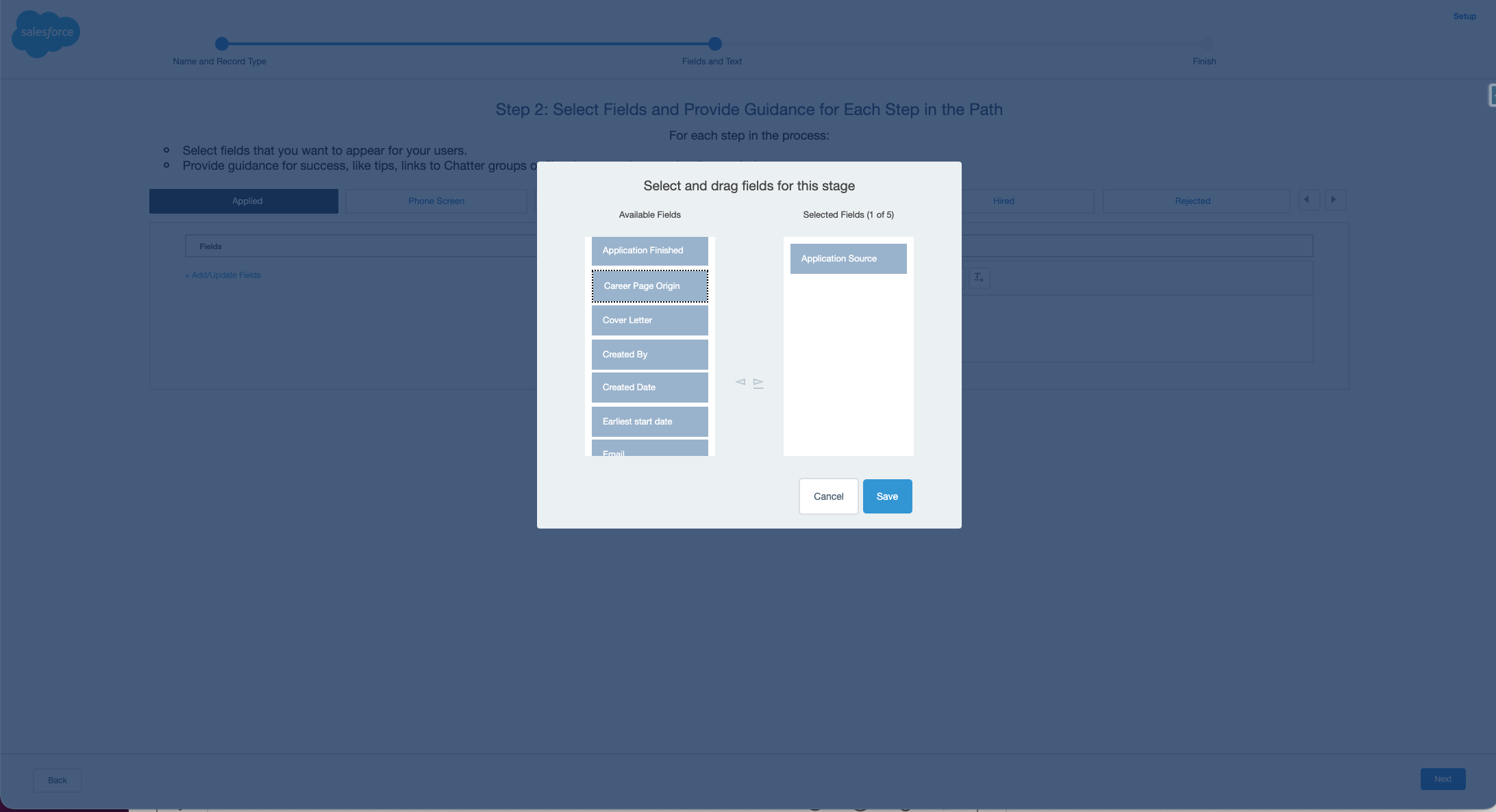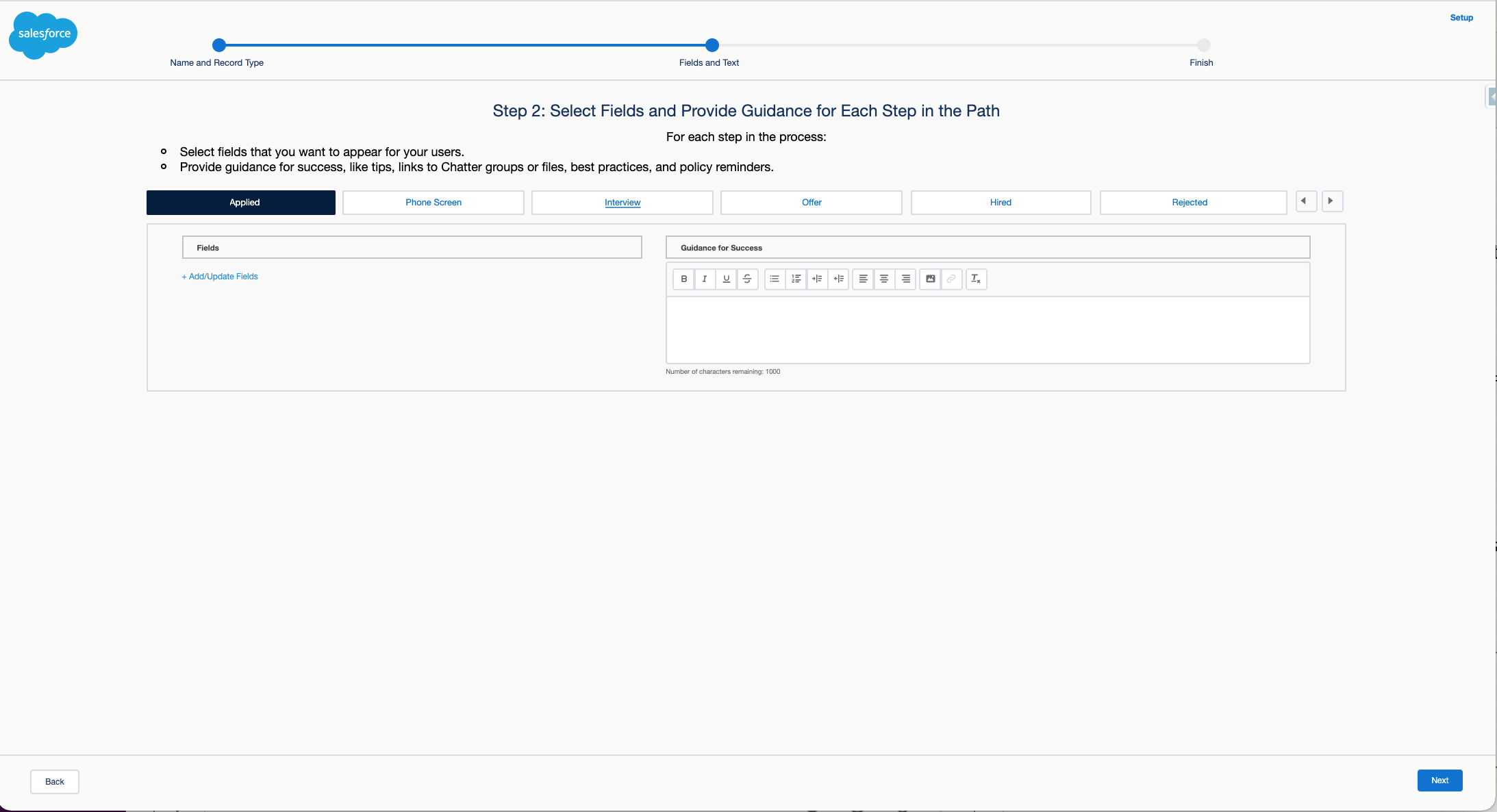 Here you add the fields that you want to appear at each candidate stage. You can also write helpful guidance for users in the box on the right.