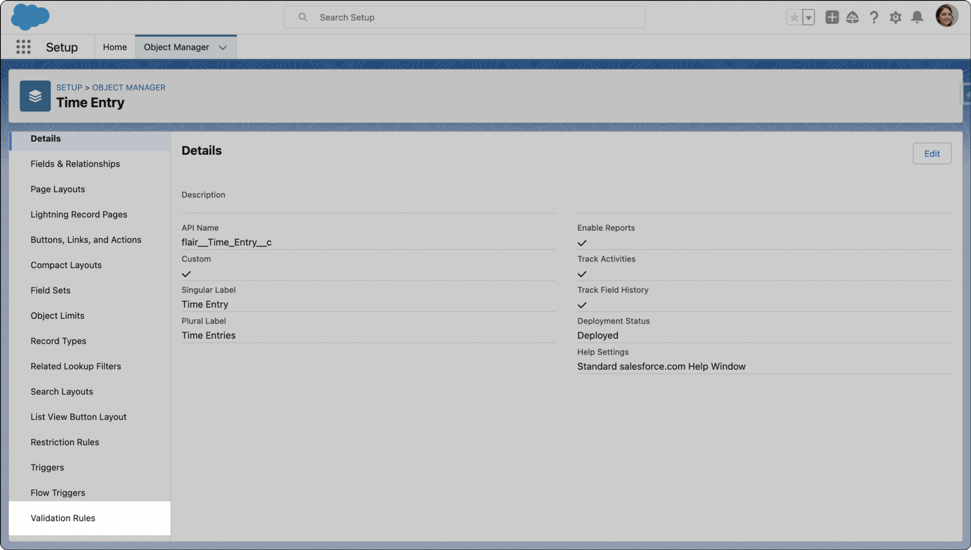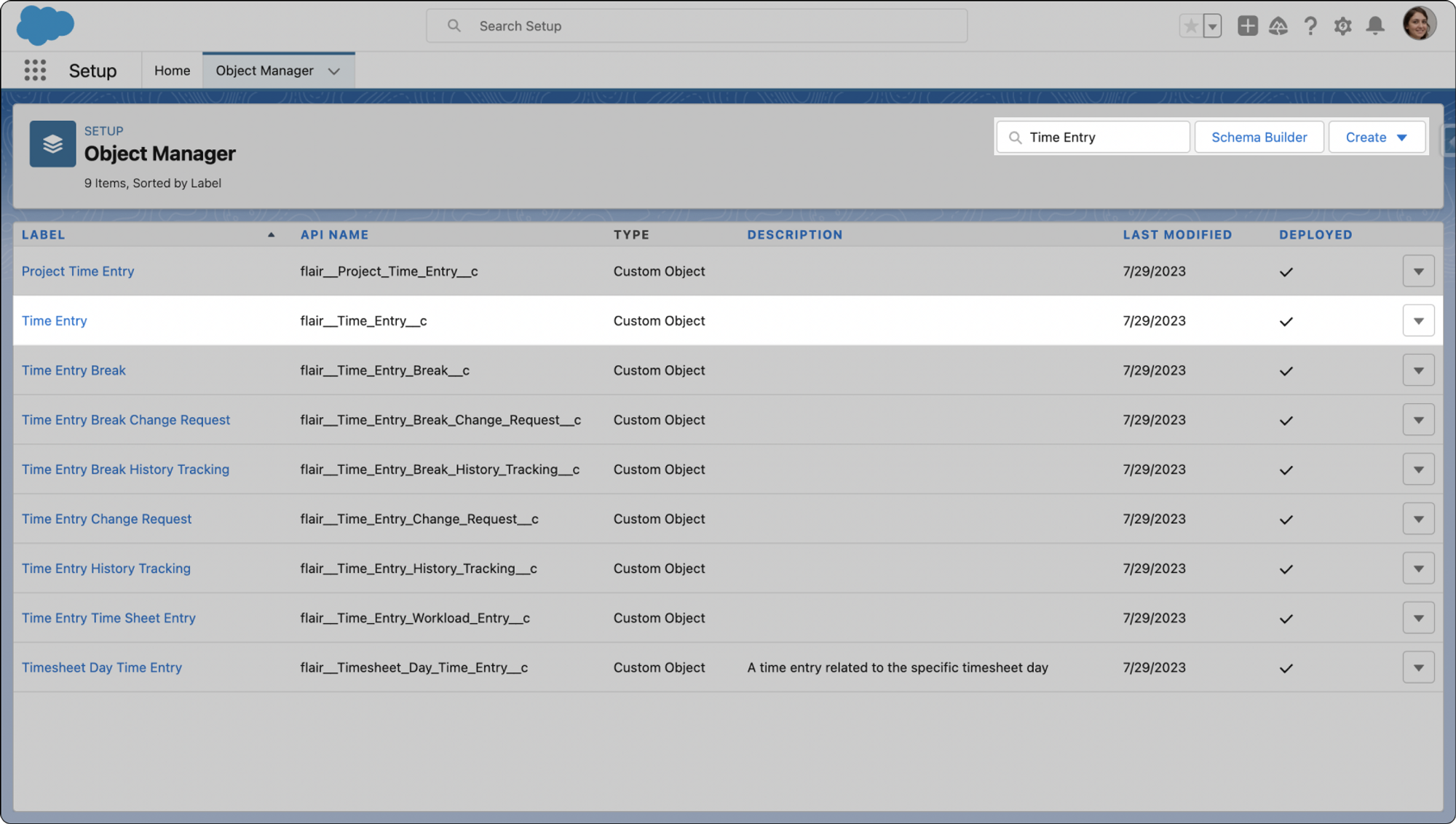 • In the Object Manager, locate and click on the Time Entry object. You can use the Quick Find search box.