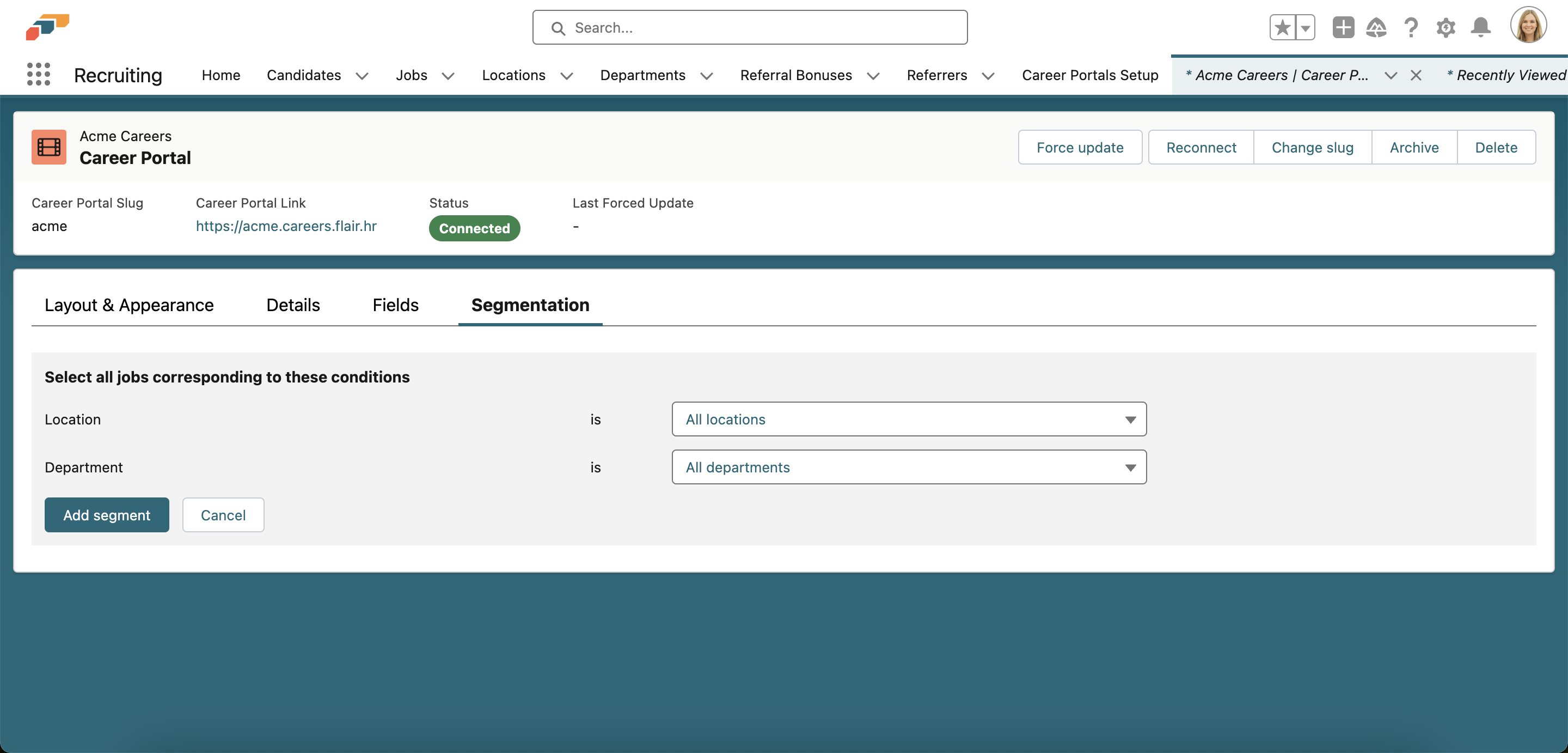 To show all your jobs on the career portal, click Add Segment and check that All Locations and All Departments are shown. Then click Add segment.