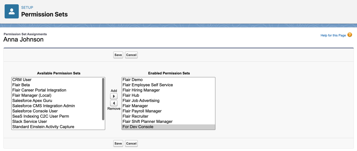• Add your newly created permission set using the Available Permission Sets section. In this example, we will add the permission set we created, For Dev Console.