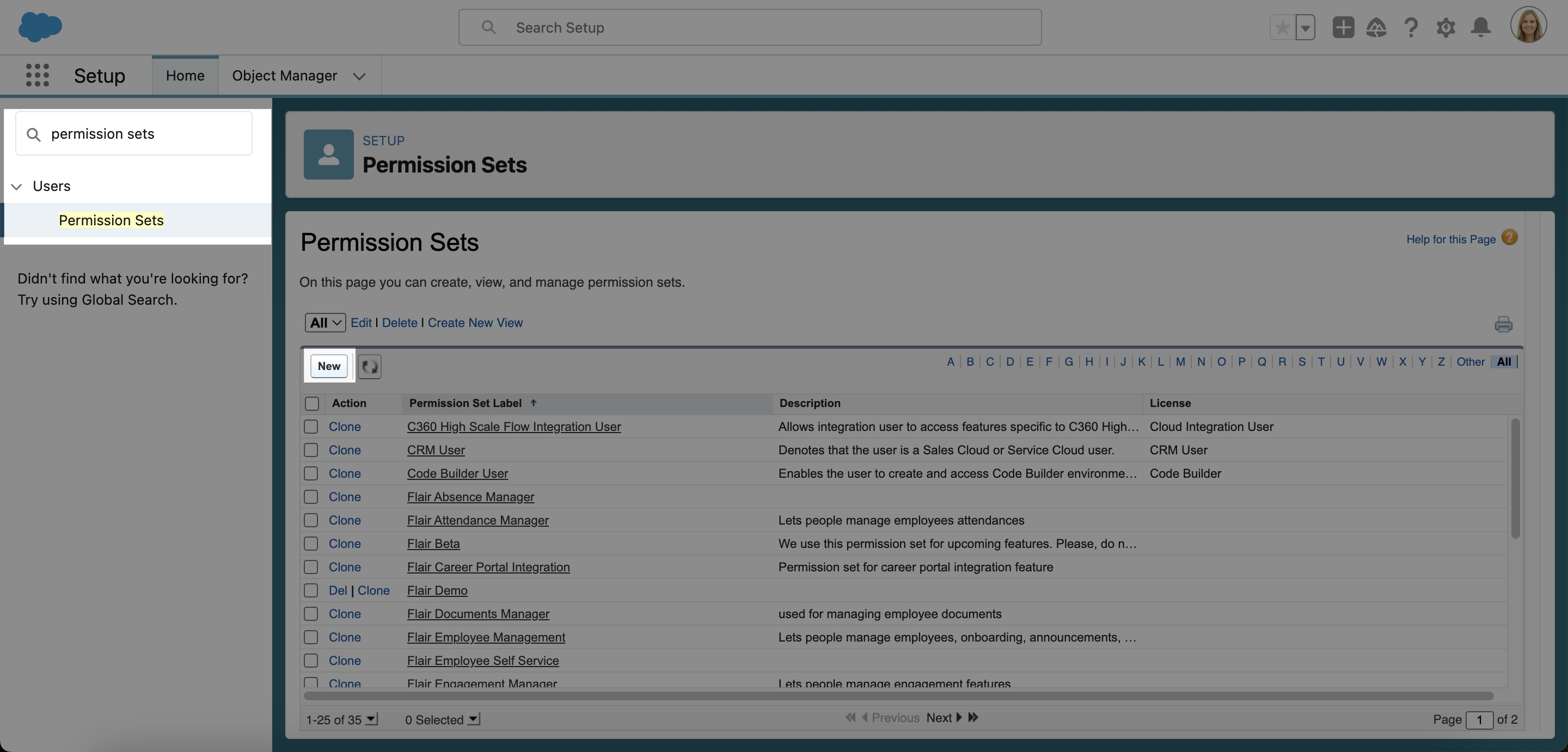 • Next, visit the Permission Sets page within the Users section and Create a new permission set. Click New on the Permission Sets dashboard. Give it a Label, API Name, and Description. Then click Save.
