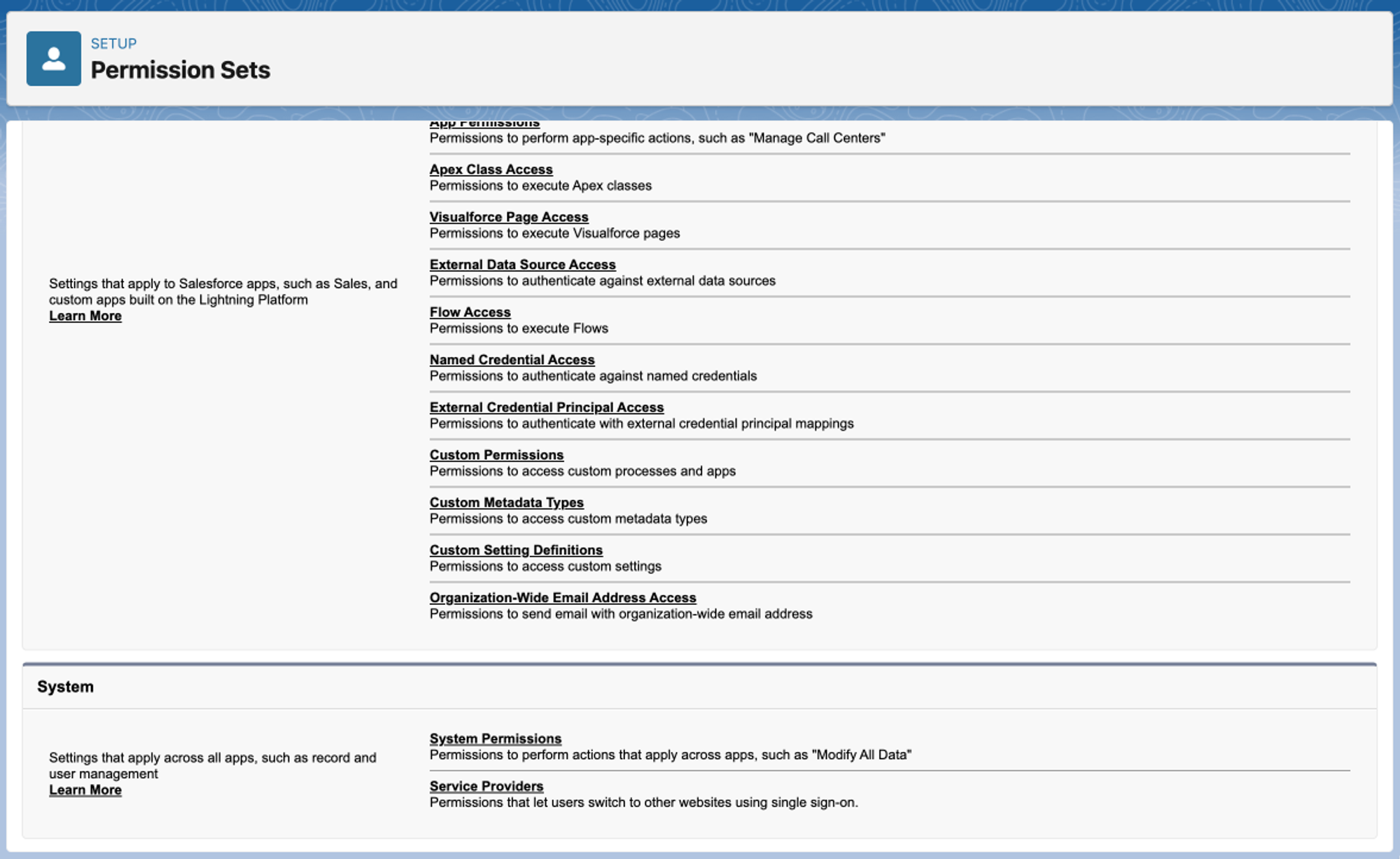 • Within the newly created permission set, click on the System Permission tab underneath the System heading. Here you will be able to edit types of permissions that are applicable across multiple applications.