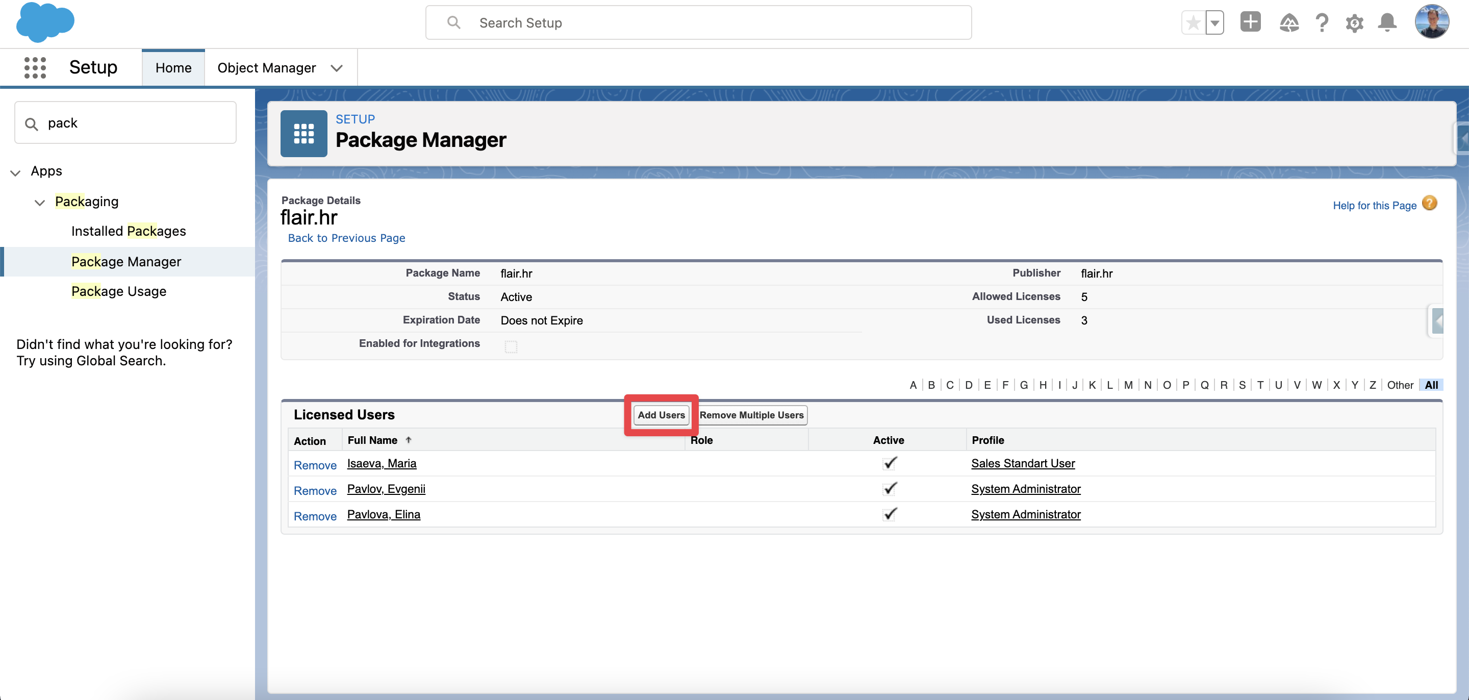 Then click Add Users in order to assign a flair license to a Salesforce user: