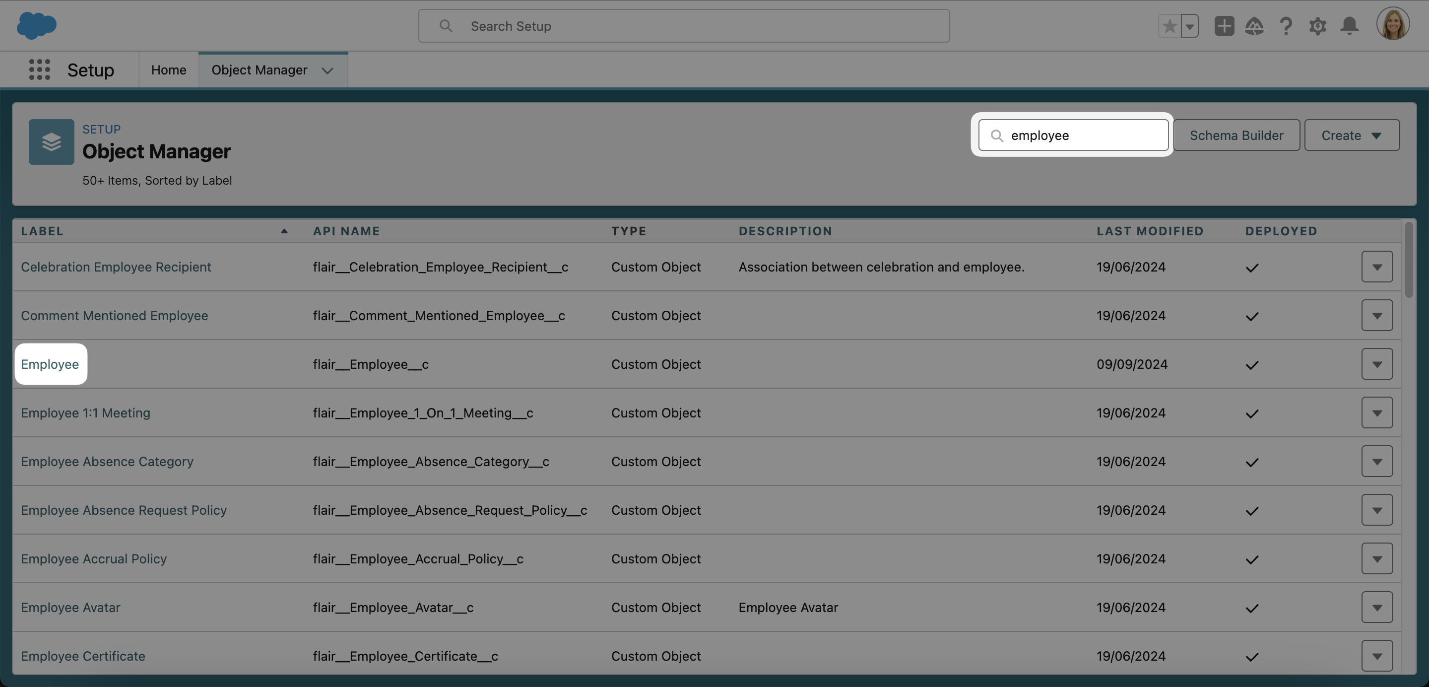 Use the Quick Find bar in the left pane to find Object Manager. Search employee using Quick Find in the top panel, then select the Employee custom object.