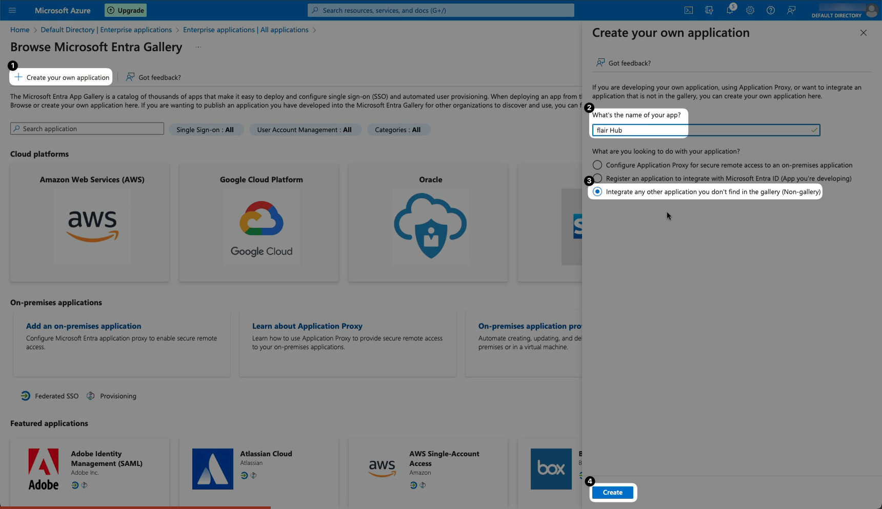 - Click Create Your Own Application from the tabs at the top of the screen. Give your app a name (e.g. flair Hub), select the option “Integrate any other application you didn’t find in the gallery (Non-gallery)”, and then click Create.