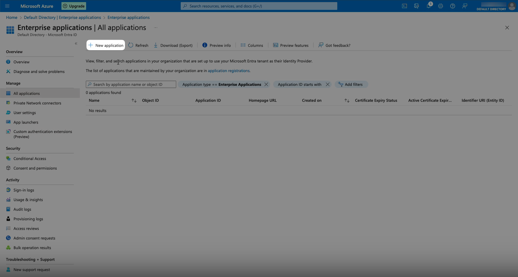 - Select Enterprise Applications from the left-side menu, then click New Application in the tabs at the top of the screen.