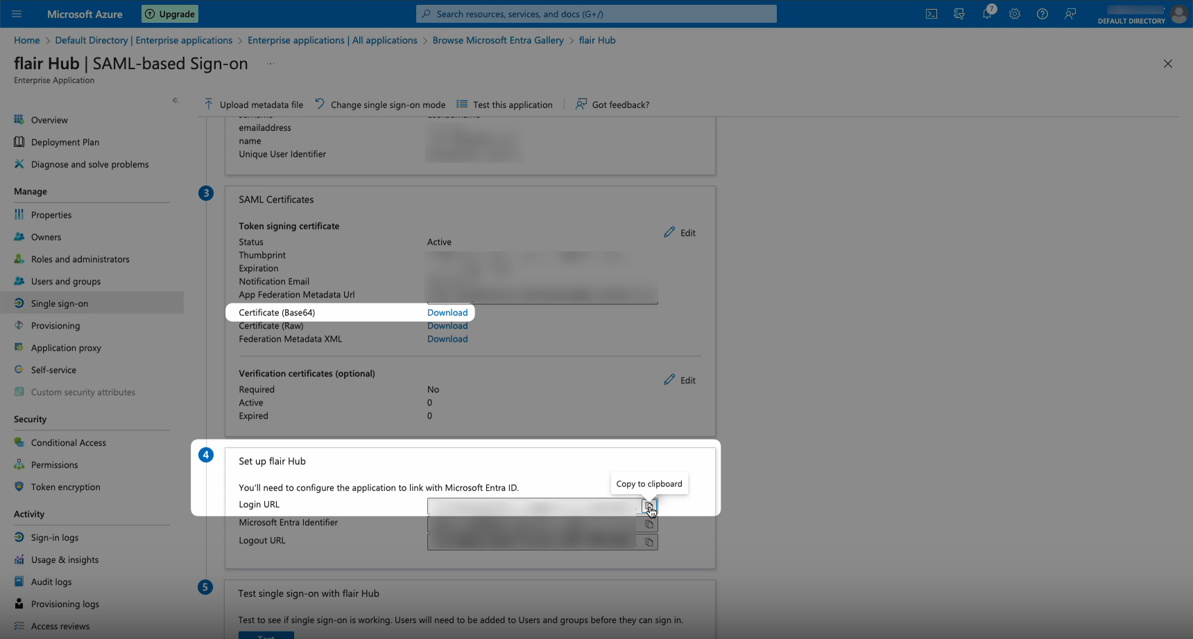 d) SSO URL: To find the SSO URL, go to back to the SAML app you created in Microsoft Azure. Scroll down to box 4 (named “Set up flair Hub”) and copy the URL in the Login URL field. Paste this URL into the SSO URL field in flair.