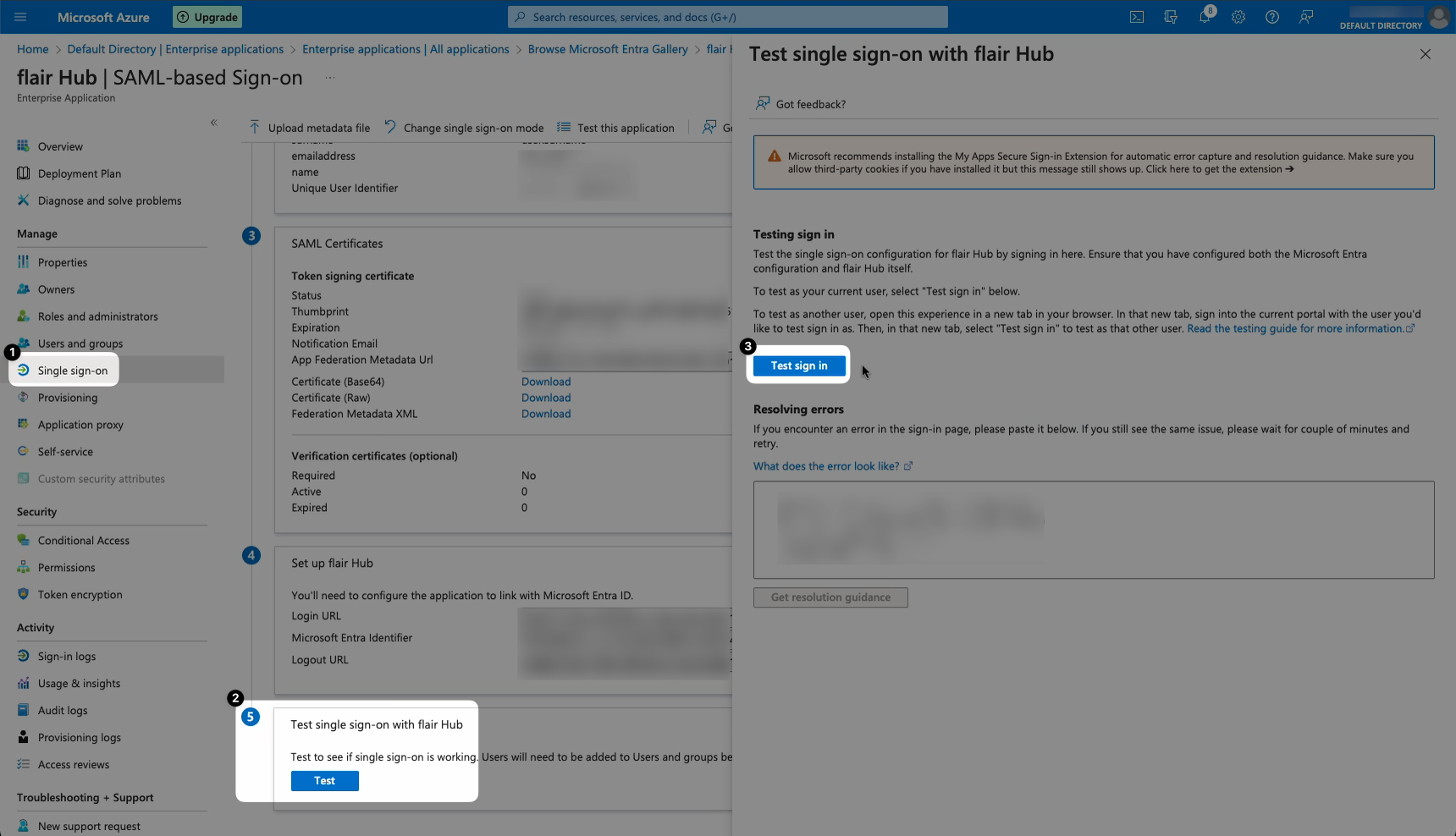 - Finally, to test your SAML login, go back to your SAML app in Microsoft Azure and open the Single Sign-On tab from the left menu. Scroll down to box 5 “Test single sign-on with flair Hub” and click Test. Then click Test Sign In.