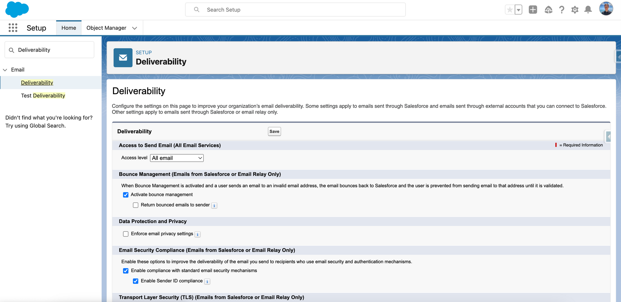 - Navigate to Setup and type Deliverability into the Quick Find box