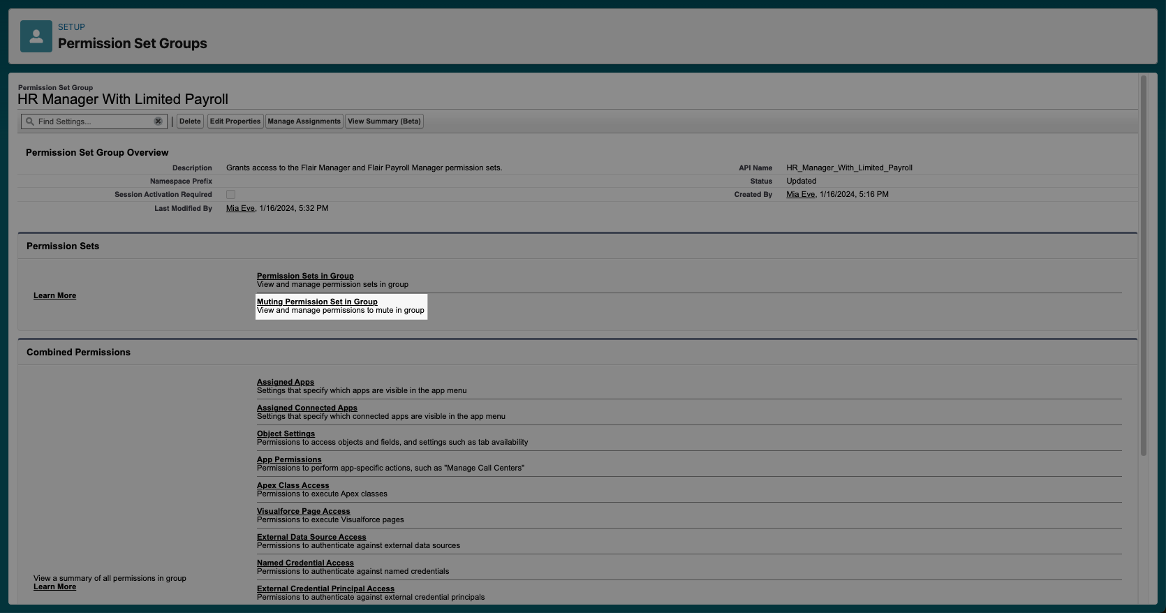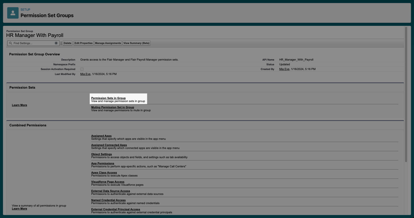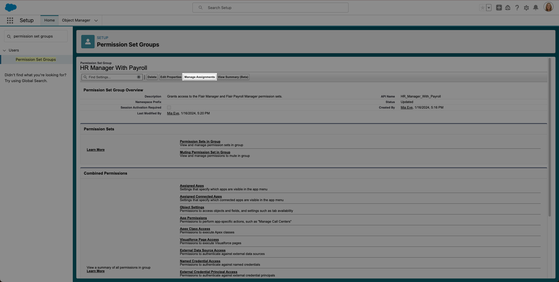 - You will now see a screen showing you an overview of the permission sets in your new group. To assign this permission set group to a user, go back to the Permission Set Groups page, select your new group, and click Manage Assignments.