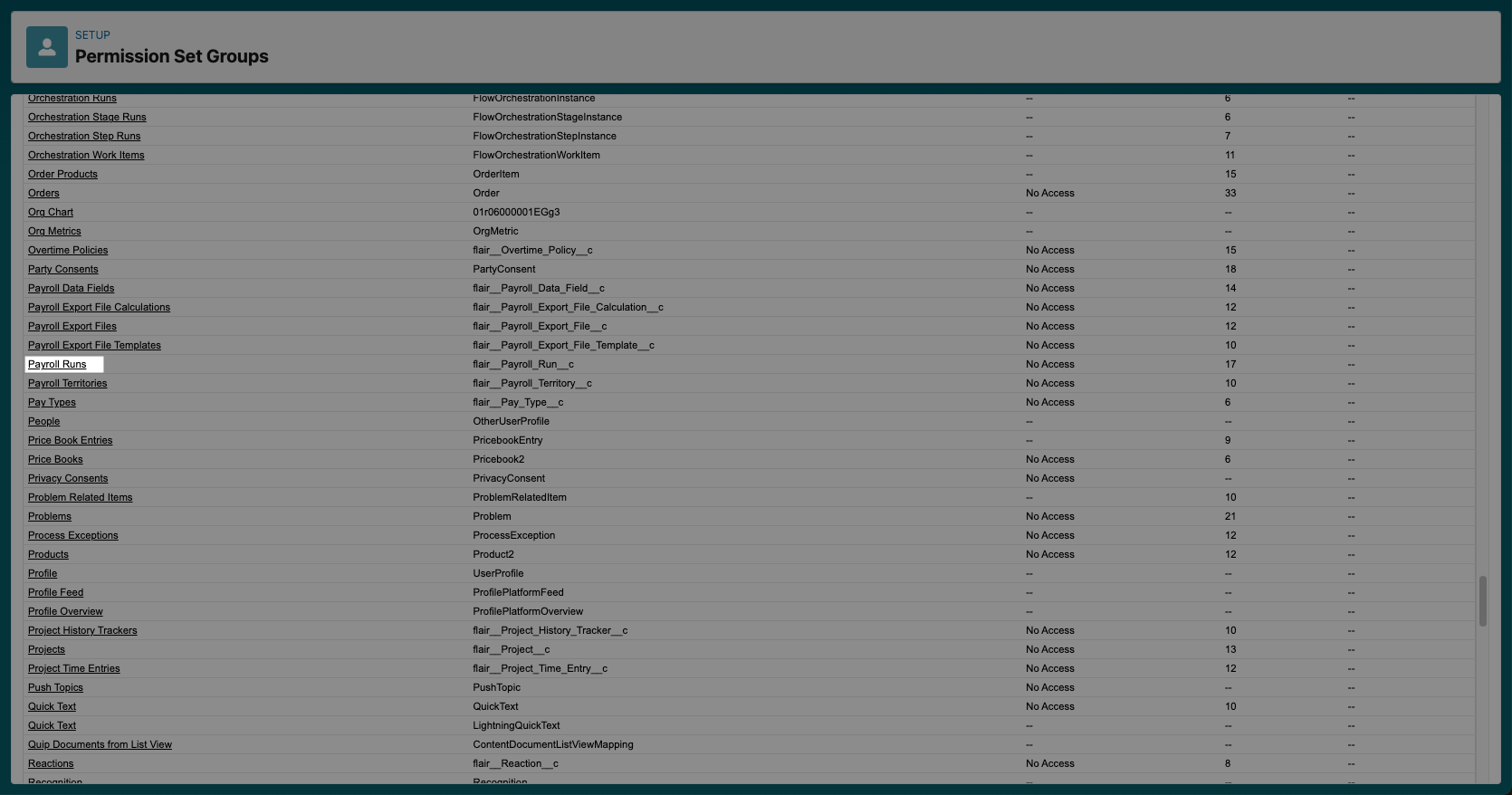- You will now see an overview of Tab Settings, Object Permissions, and Field Permissions. In our example, you can see that the Flair Payroll Manager is granting full permissions to the Payroll Runs object, including Delete permission. To mute this permission, click Edit.