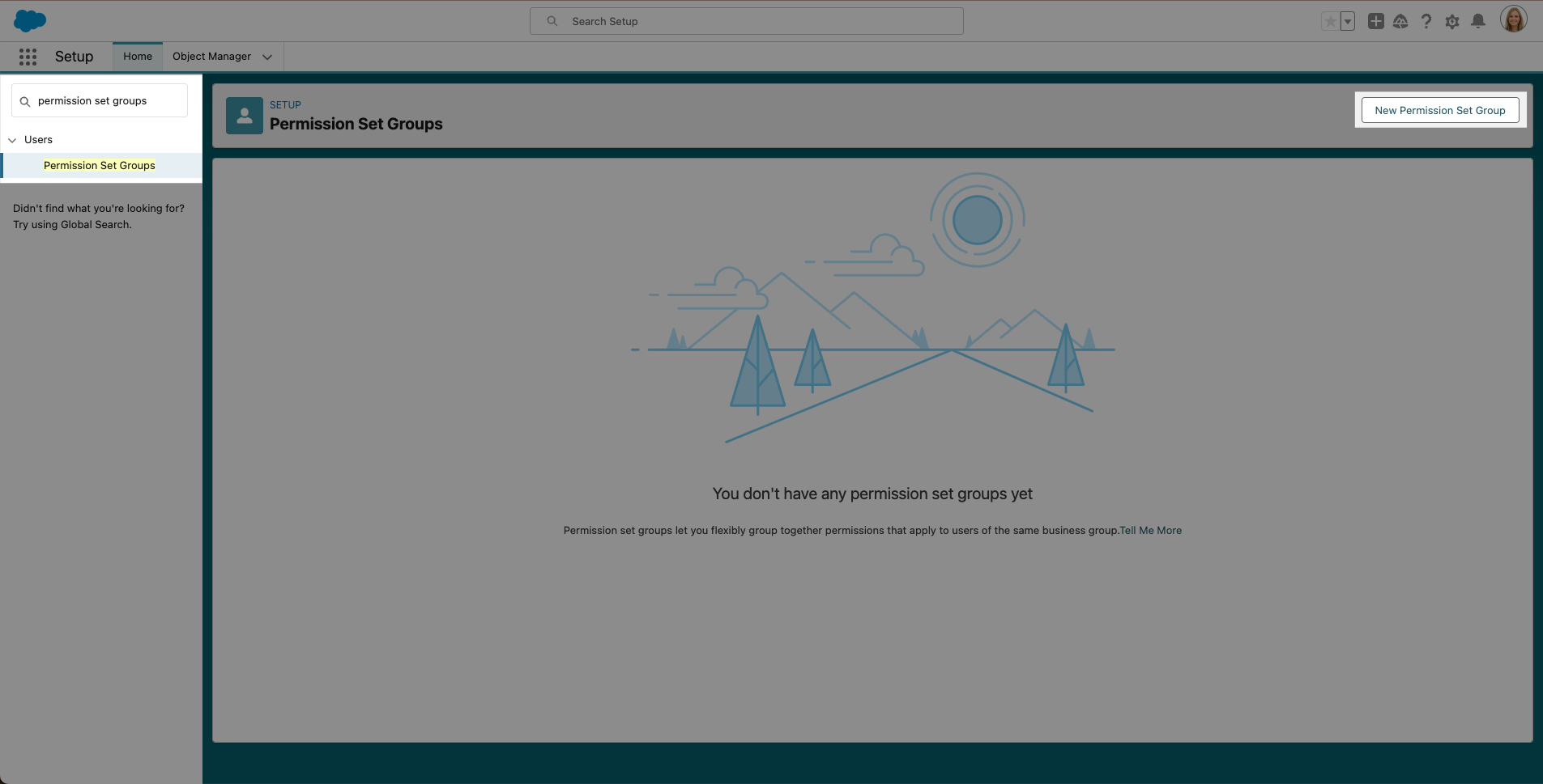 - Type permission set groups into the Quick Find search bar on the left. Then click New Permission Set Group.