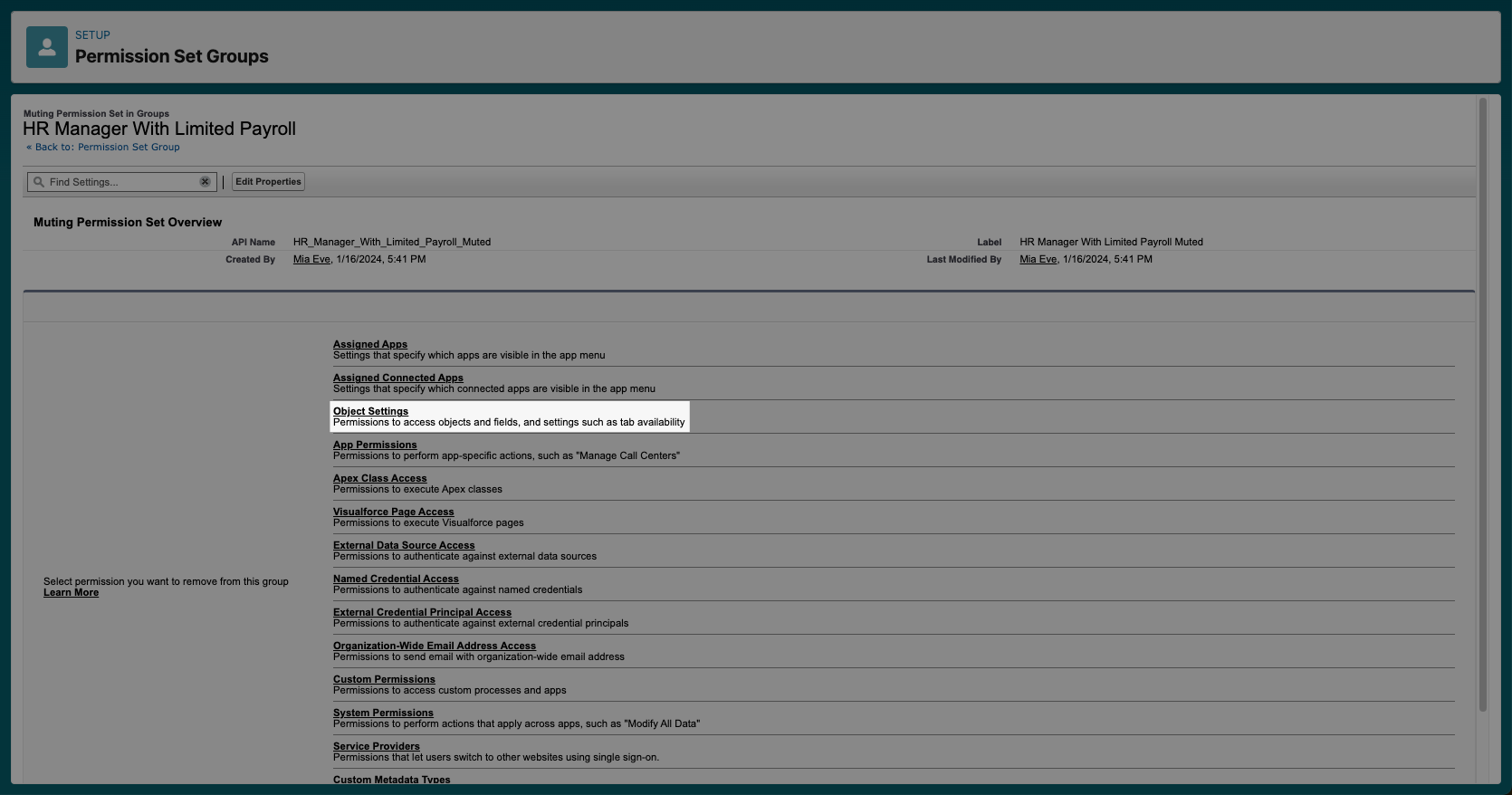 After following these steps, you can check whether the muting worked by opening the Object Settings for your permission set group. The limitations you added to the muting permission set will override the original permissions, meaning you have successfully restricted access within a permission set group without altering the permissions of an existing permission set.