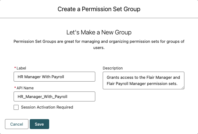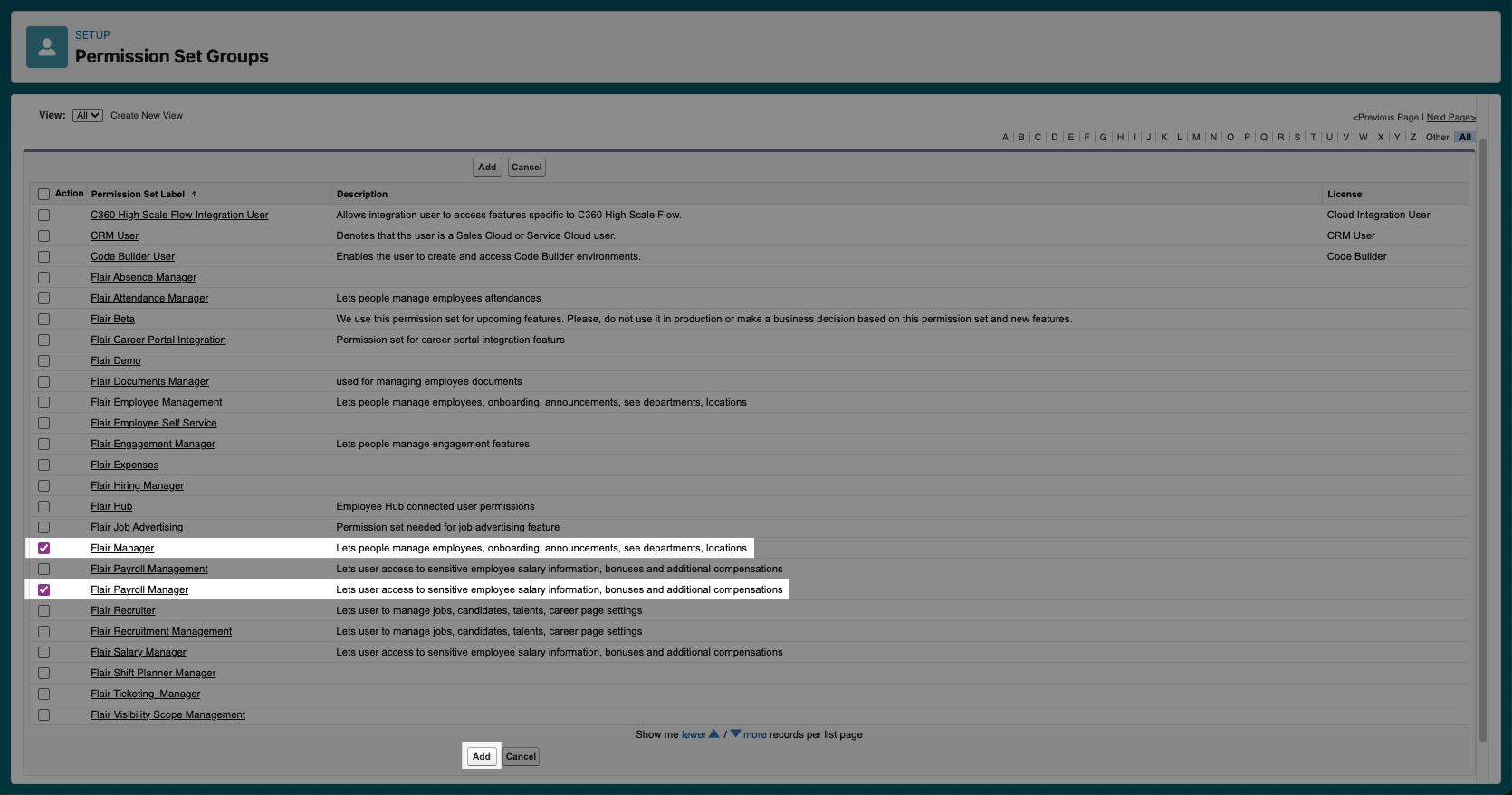For example, if your HR managers also handle payroll, you could create a permission set combining Flair Manager and Flair Payroll Manager.