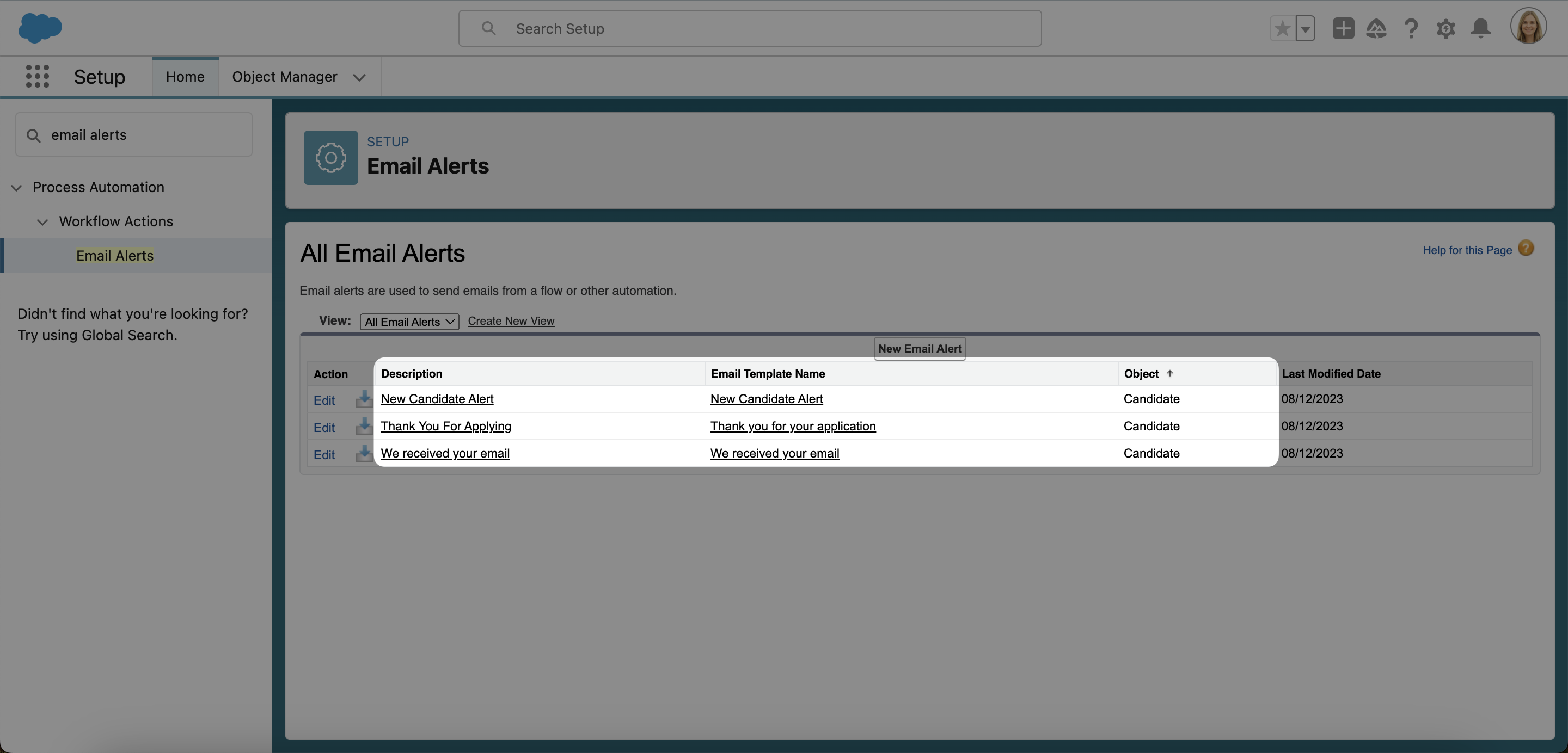 Enter a name into the Email Service Name field to help you easily recognize the email service later on. Then click the magnifying glass icon 🔍 next to Apex Class. Type Email into the search bar to find relevant results. Now select EmailToExistingCandidateAndTalent. Then click Save to set up your email service.