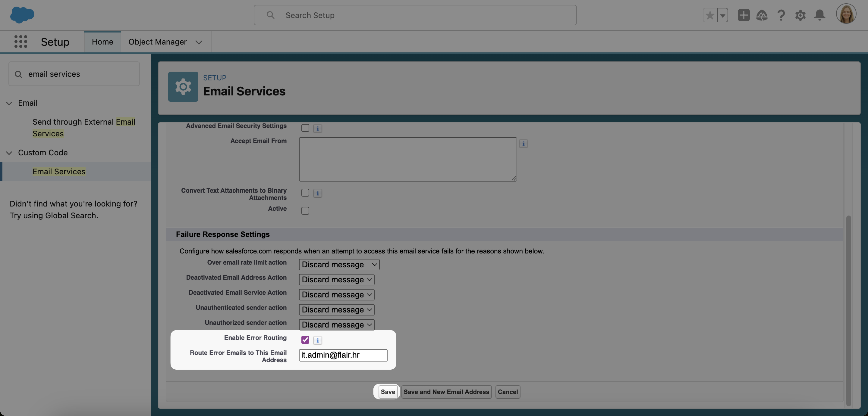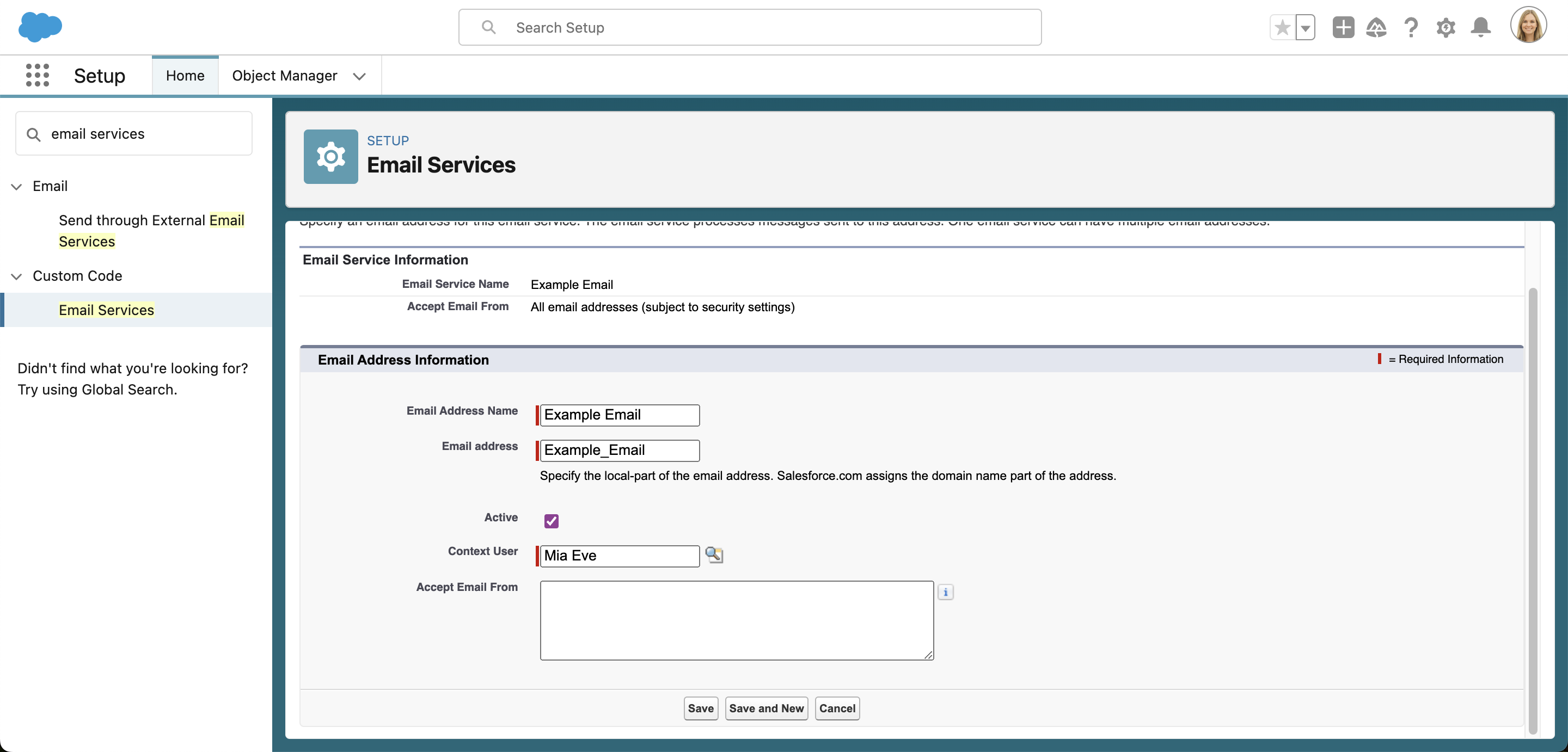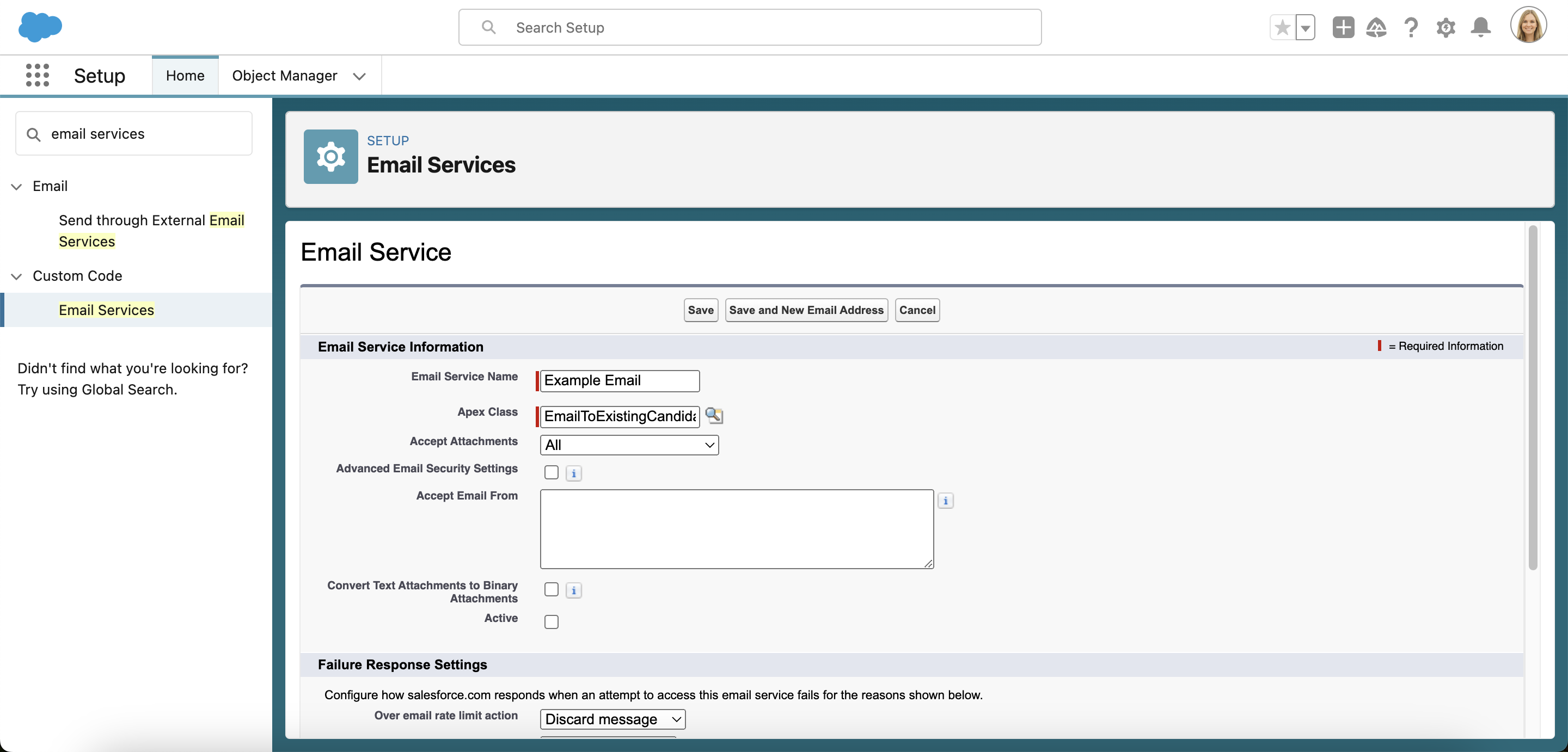 Go to Salesforce Setup and enter Email Services into the Quick Find search bar. Click New Email Service.