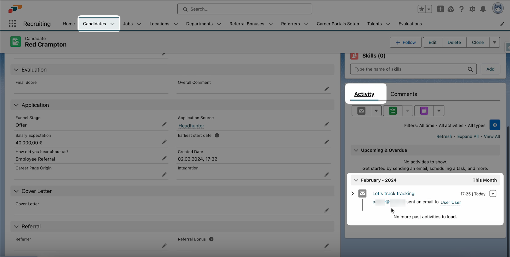 You can also track emails sent to the candidate. To do this, use the email address that you added to your email service and add it into bcc when you send emails to candidates. Your sent email will then also appear in the Activity section of the candidate’s record.