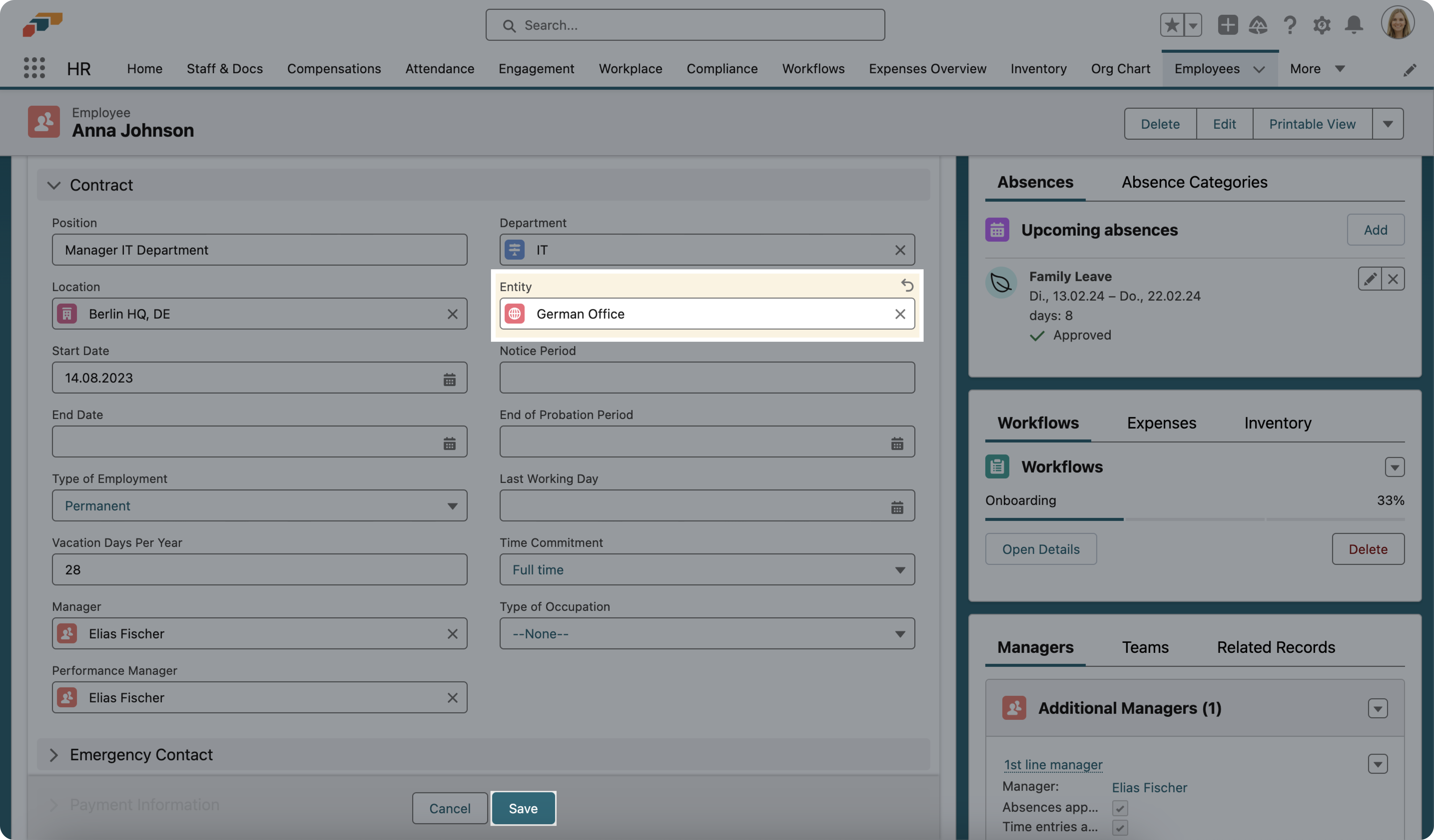 - You can then assign employees to this new entity by opening their employee record and selecting the entity in the Entity field of the Contract section.