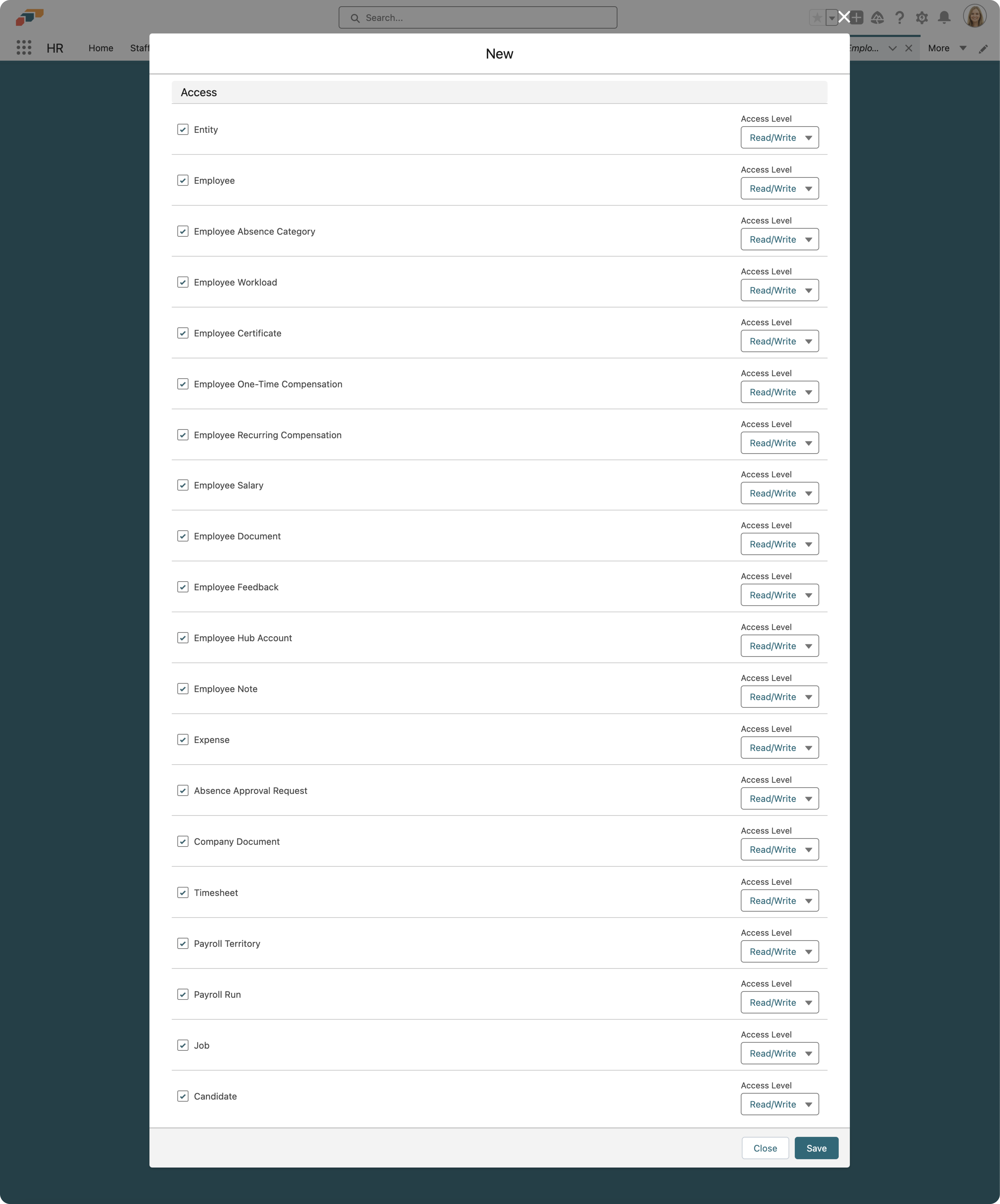 - In the Access section, you can choose which objects are included in your visibility scope. For each object, you can toggle between Read/Write access (ability to view and modify the object) or Read Only access. To restrict visibility entirely, uncheck the checkbox to the left of the object.