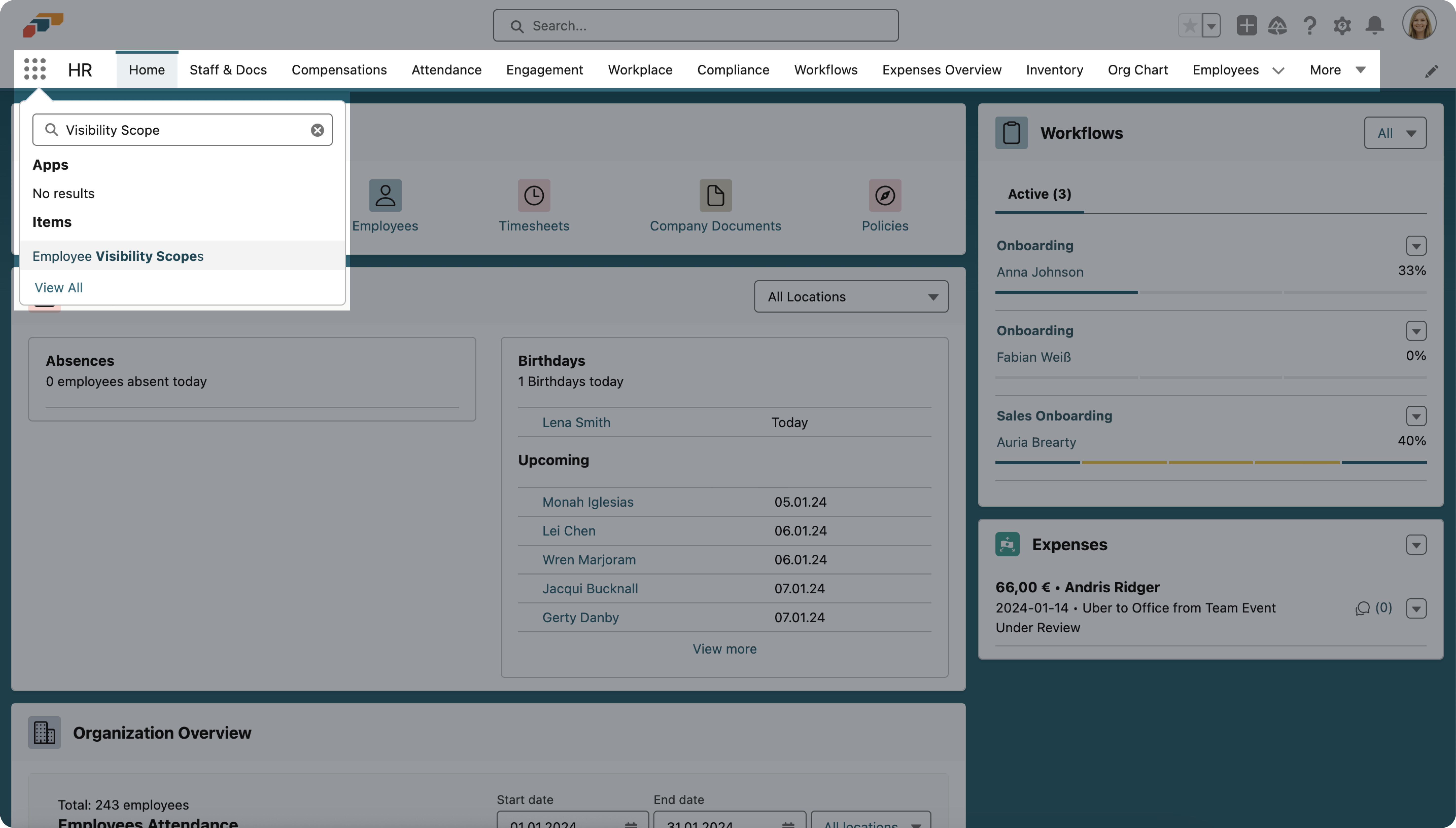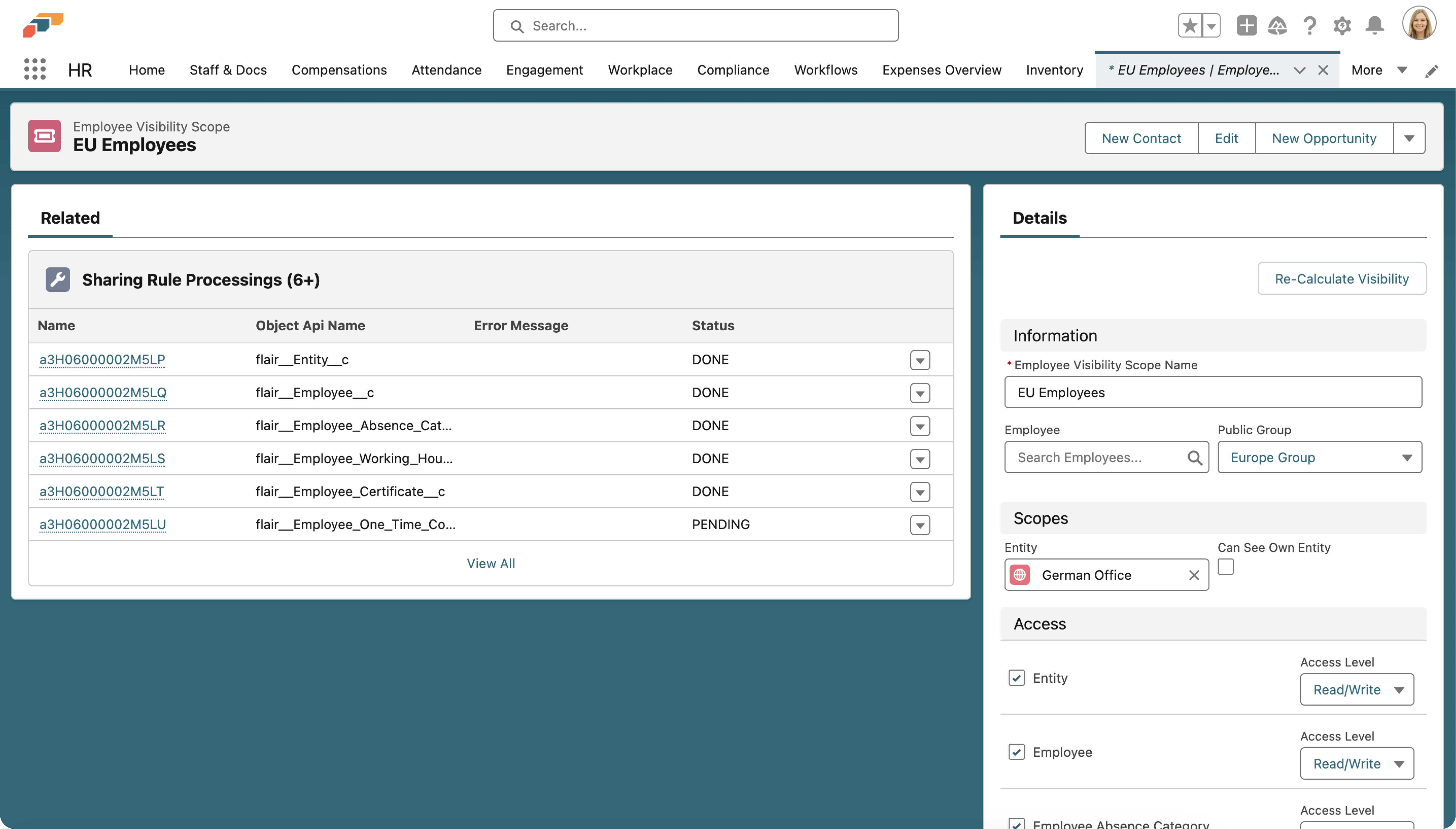 ๐ง Please note, the visibility scope logic will not work if you have assigned a user a permission set with View All/Modify All permissions. This includes the Flair Manager, Flair Payroll Manager, and Flair Recruiter permission sets. In addition, users with the System Administrator profile will be able to see all records, even if you apply a visibility scope.
