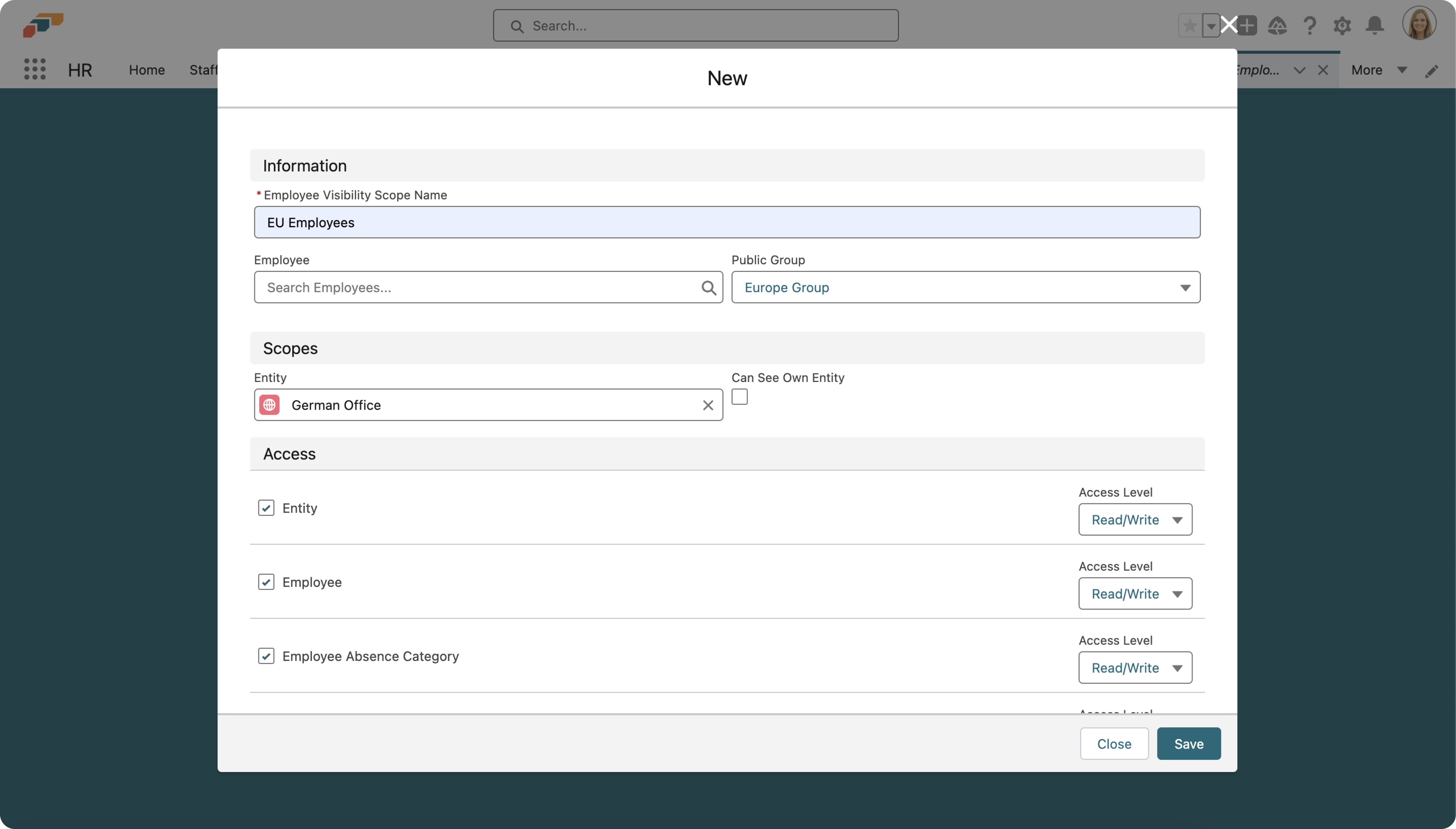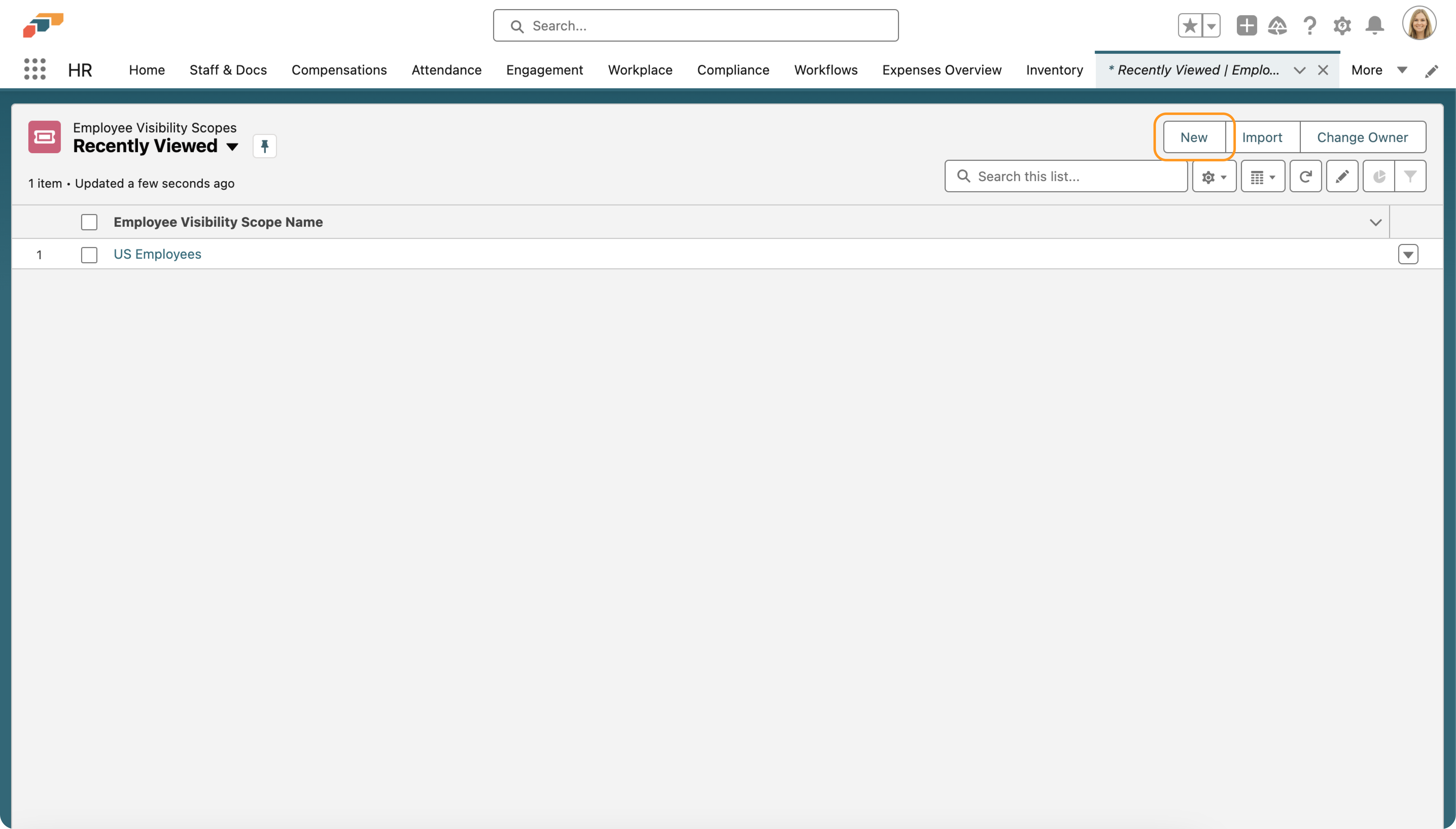 - To create a visibility scope, open the App Launcher and search for visibility scope. Select the page named Employee Visibility Scopes. Click the New button.